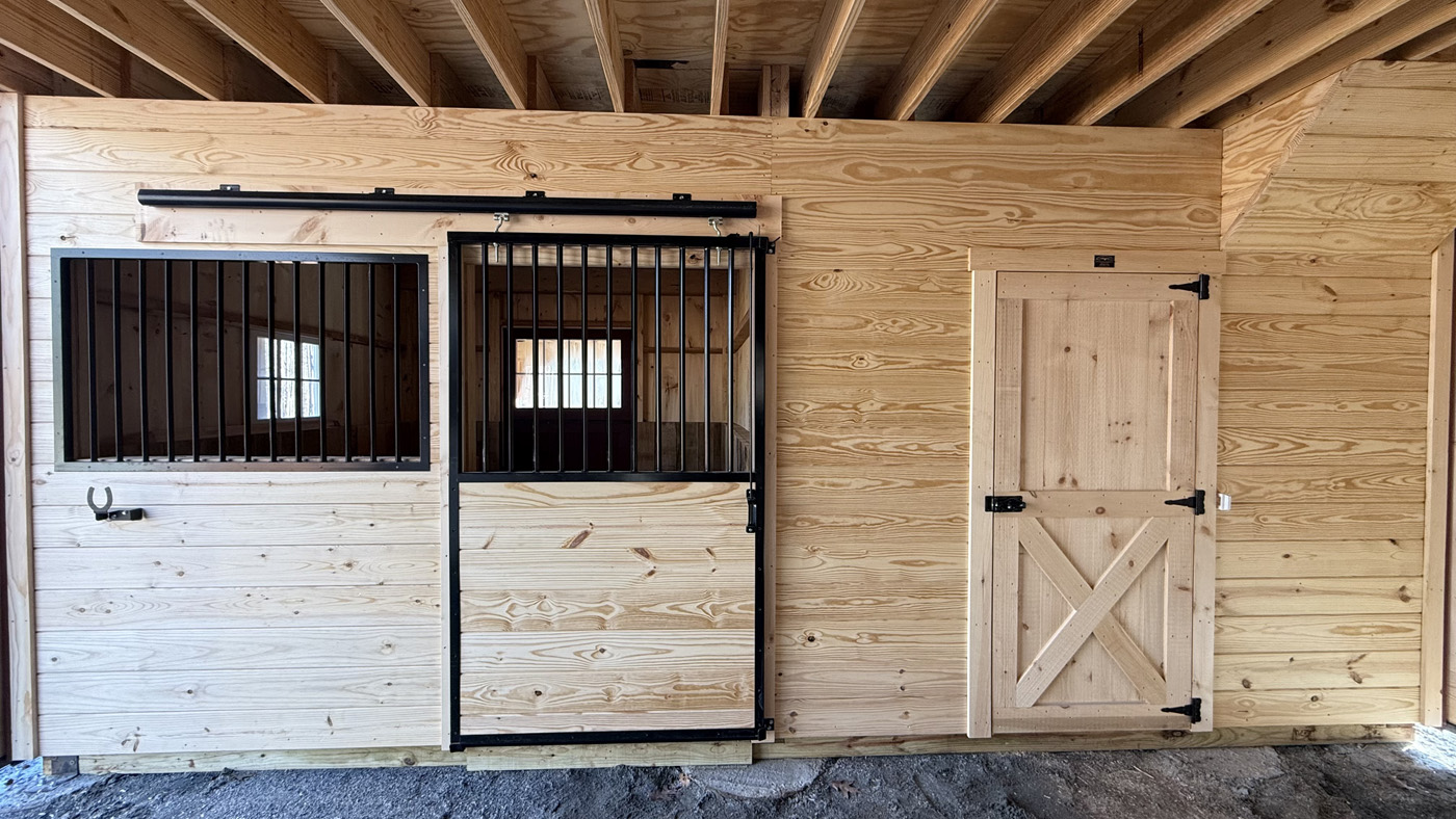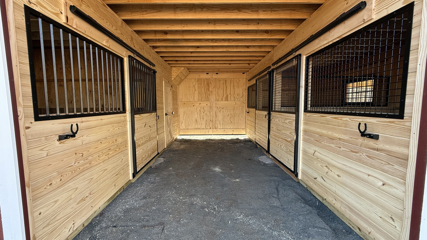 This modular horse barn has (3) 10’x10’ stalls, a 10’x10’ tack room, and a 10’x20’ center aisle. It has a full loft accessed via stairs in the tack room. One end of the loft has a swinging loft door, and the other end has a sliding window. On each end, up near the peak, is a gable vent. The stalls have a sliding stall door into the center aisle and a dutch door with window to the outside. One stall is lined with 4’ high oak kick boards. Two of the stalls have a chicken door. The tack room has a floor, sliding window, and a service door into the center aisle. The center aisle has double sliding doors at each end, with extra sliding windows on either side of the front doors.