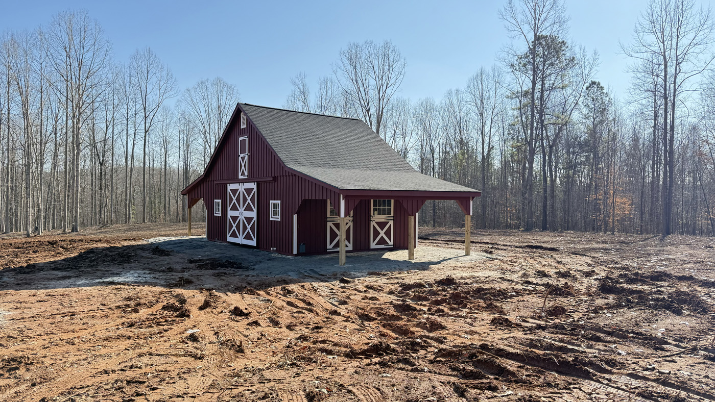 This is a 30’x20’ modular horse barn in the high country style with (2) 10’ lean-tos. This Blackstone, VA horse barn was built with white pine board & batten siding painted with red paint manufactured by Sherwin Williams. The corner trim, window trim, door trim, and crossbucks are painted white. The roof has 8 pitch rafters and architectural shingle roof with GAF Timberline HDZ (Charcoal color) shingles. The windows are sliding wood barn sash windows manufactured by Bird-In-Hand Windows & Doors. The 5’x9’ roll doors, 4’x7’ dutch doors with window, service door, loft door, and gable vents are manufactured by J&N Structures.