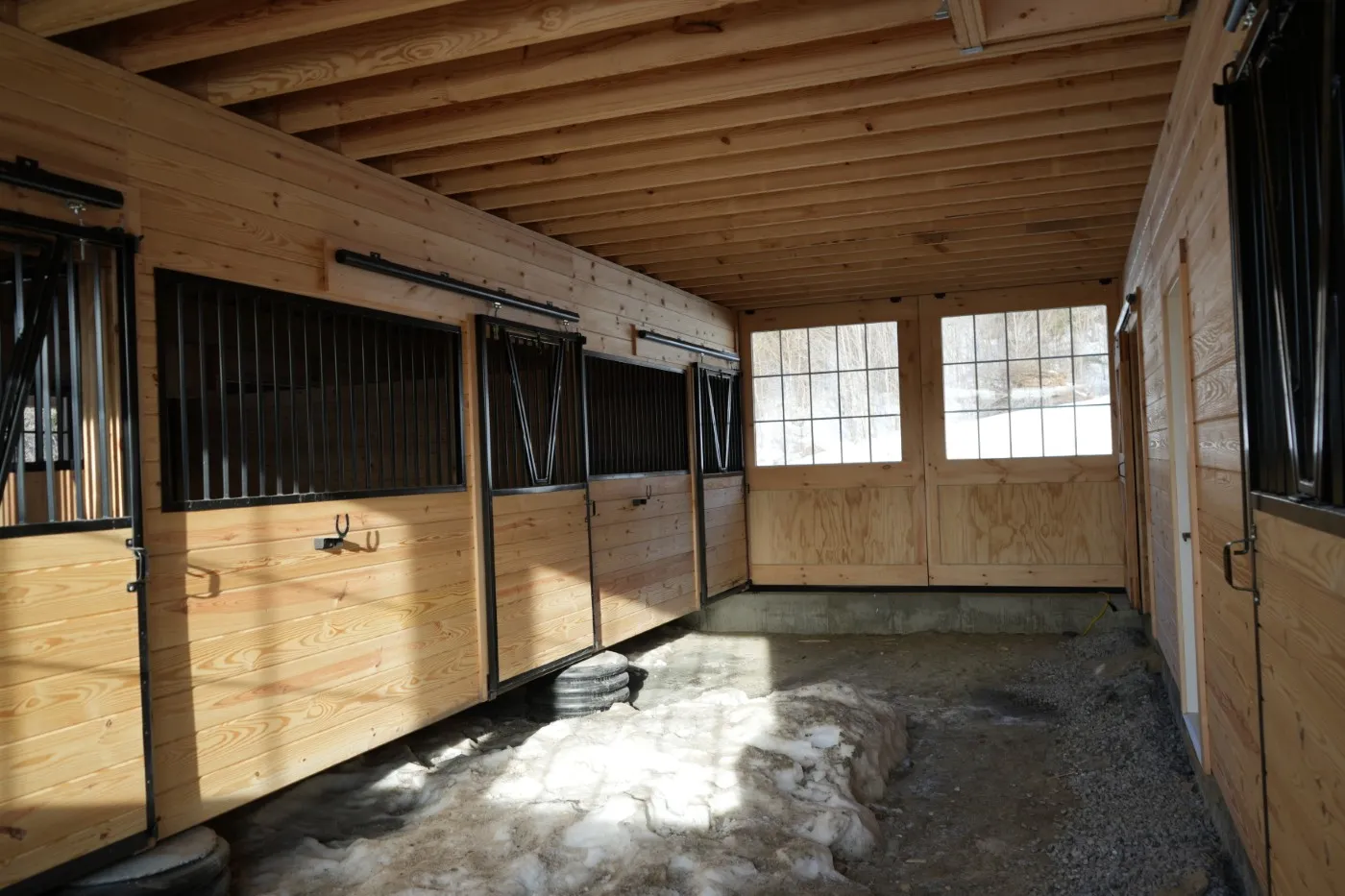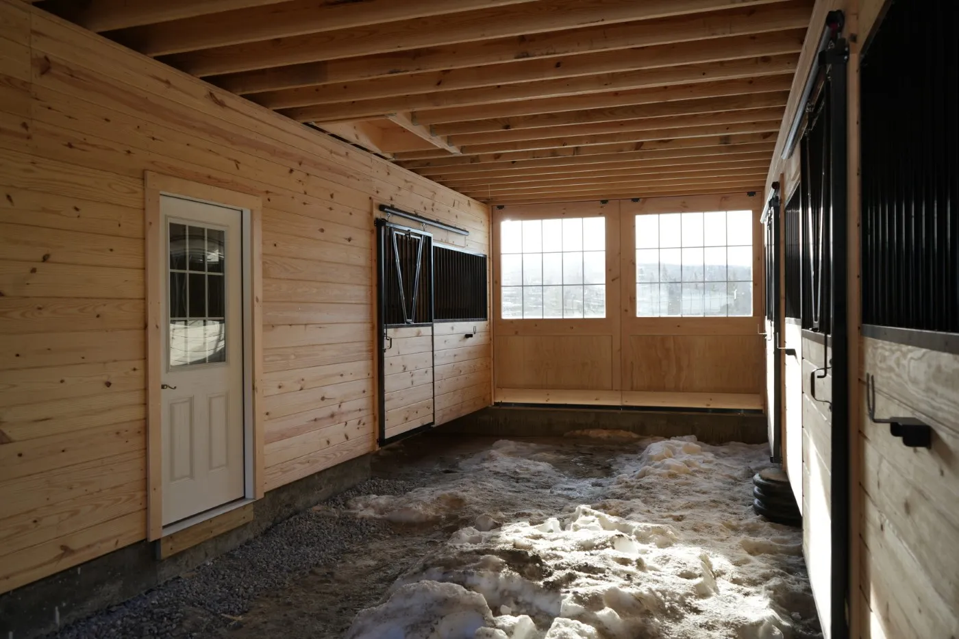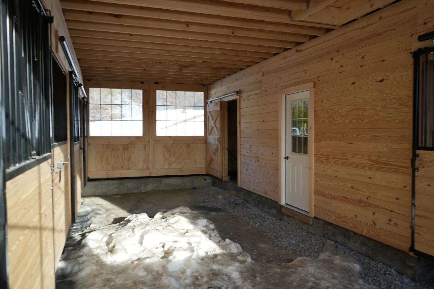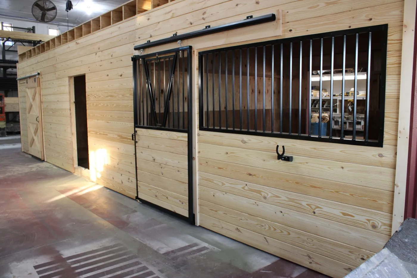 This modular horse barn has (4) 12'x12' stalls and a 12'x16' tack room and a 12'x8' storage room and a 12'x36' center aisle. It has a full loft accessed via stairs in the storage room. One end of the loft has swinging double loft doors with transom windows and the other end has a sliding window and over the center aisle is a hay hole with a hinged cover. On each end, up near the peak, is a gable vent. The stalls are lined with 4' high oak kick boards and have a sliding stall door with hinged yoke into the center aisle and a sliding window and a dutch door to the outside. Between (2) stalls is a removable partition. The tack room has (2) insulated double-hung windows and an insulated service door with window into the center aisle. The storage room has a service door to the outside and an insulated service door with window into the tack room and a sliding door into the center aisle. The center aisle has double sliding doors with windows at each end. On either side of the sliding doors are extra sliding windows.