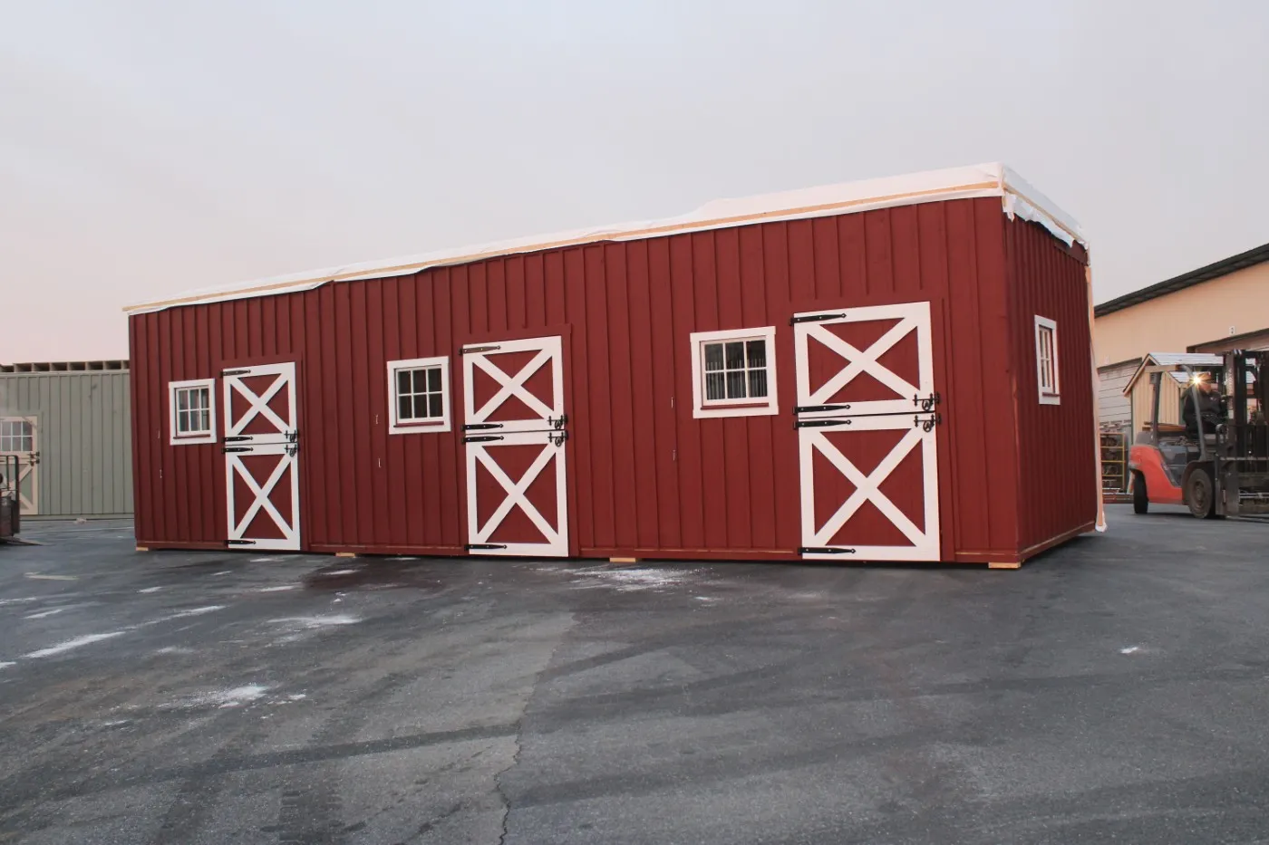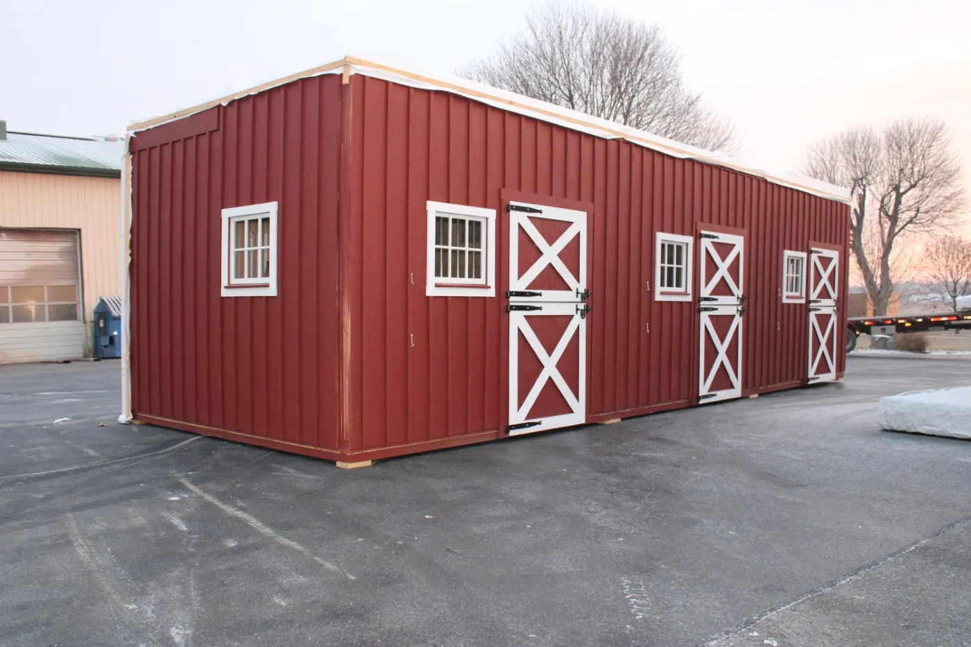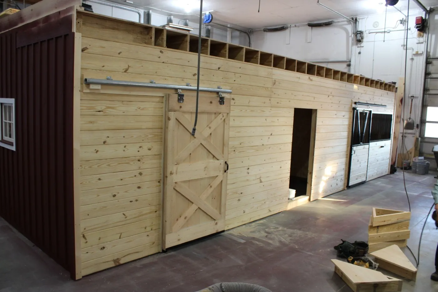 This modular horse barn has (4) 12'x12' stalls and a 12'x16' tack room and a 12'x8' storage room and a 12'x36' center aisle. It has a full loft accessed via stairs in the storage room. One end of the loft has swinging double loft doors with transom windows and the other end has a sliding window and over the center aisle is a hay hole with a hinged cover. On each end, up near the peak, is a gable vent. The stalls are lined with 4' high oak kick boards and have a sliding stall door with hinged yoke into the center aisle and a sliding window and a dutch door to the outside. Between (2) stalls is a removable partition. The tack room has (2) insulated double-hung windows and an insulated service door with window into the center aisle. The storage room has a service door to the outside and an insulated service door with window into the tack room and a sliding door into the center aisle. The center aisle has double sliding doors with windows at each end. On either side of the sliding doors are extra sliding windows.