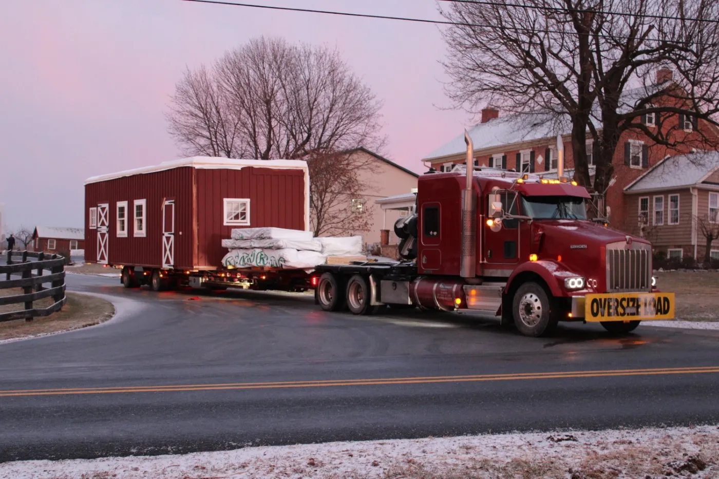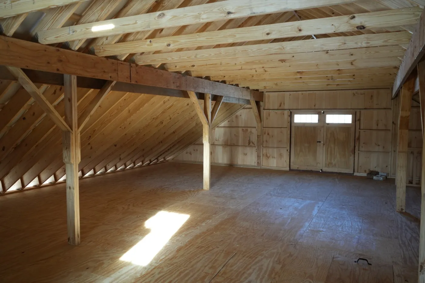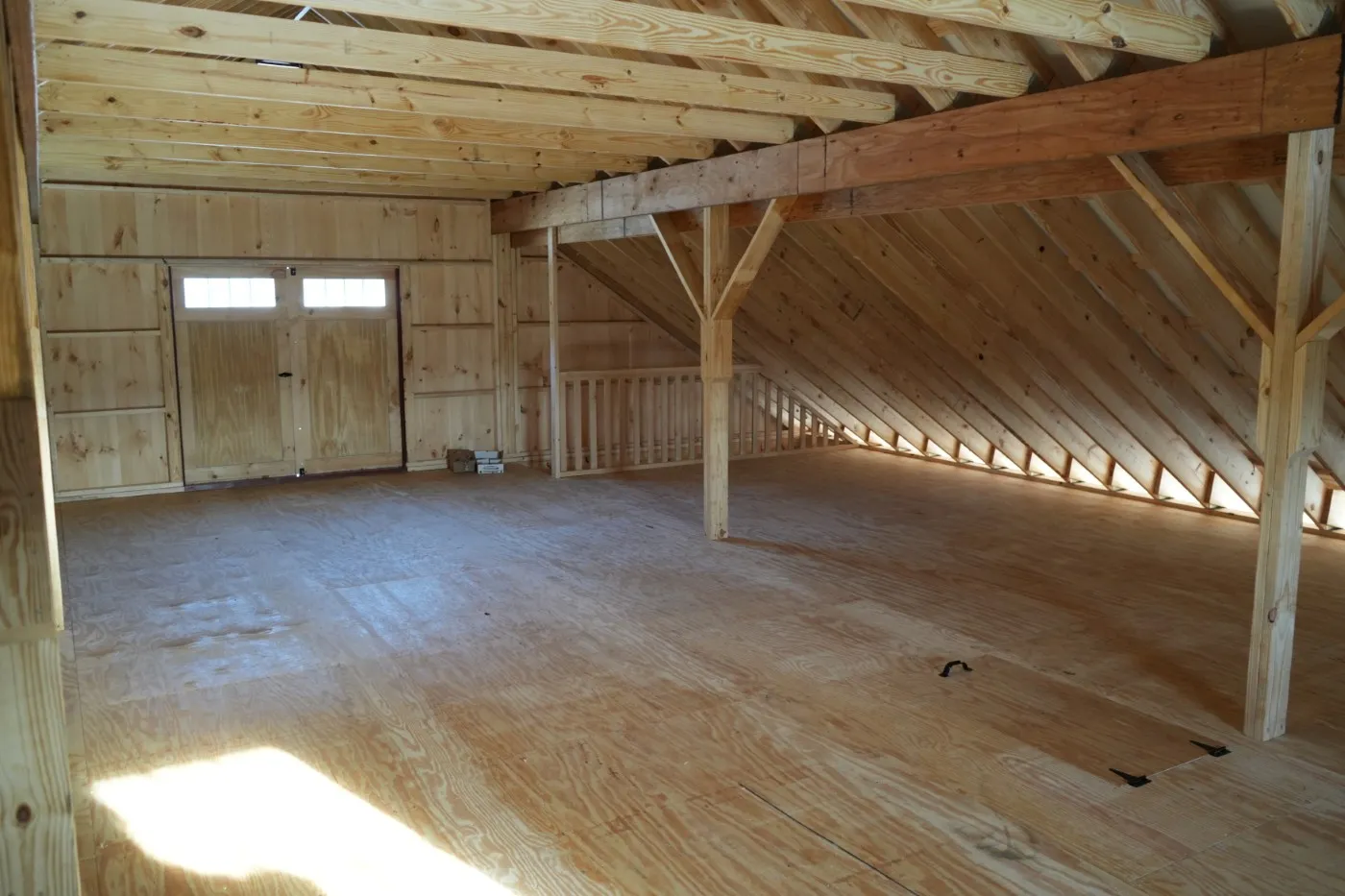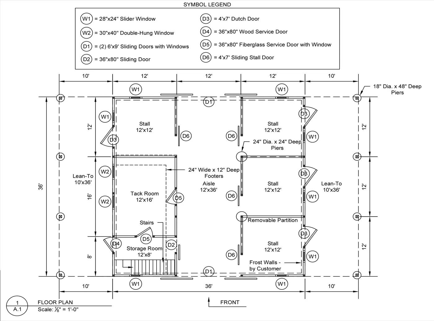 This modular horse barn has (4) 12'x12' stalls and a 12'x16' tack room and a 12'x8' storage room and a 12'x36' center aisle. It has a full loft accessed via stairs in the storage room. One end of the loft has swinging double loft doors with transom windows and the other end has a sliding window and over the center aisle is a hay hole with a hinged cover. On each end, up near the peak, is a gable vent. The stalls are lined with 4' high oak kick boards and have a sliding stall door with hinged yoke into the center aisle and a sliding window and a dutch door to the outside. Between (2) stalls is a removable partition. The tack room has (2) insulated double-hung windows and an insulated service door with window into the center aisle. The storage room has a service door to the outside and an insulated service door with window into the tack room and a sliding door into the center aisle. The center aisle has double sliding doors with windows at each end. On either side of the sliding doors are extra sliding windows.