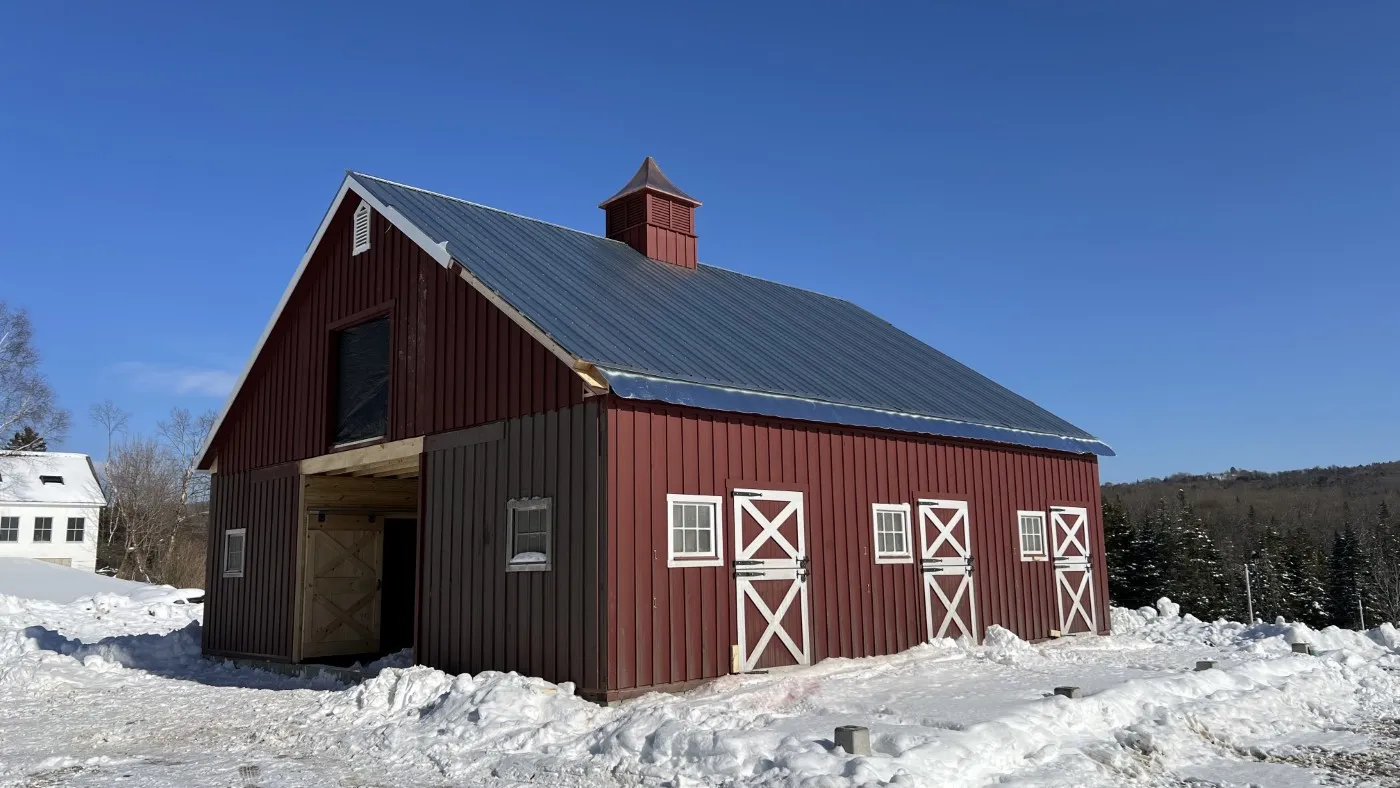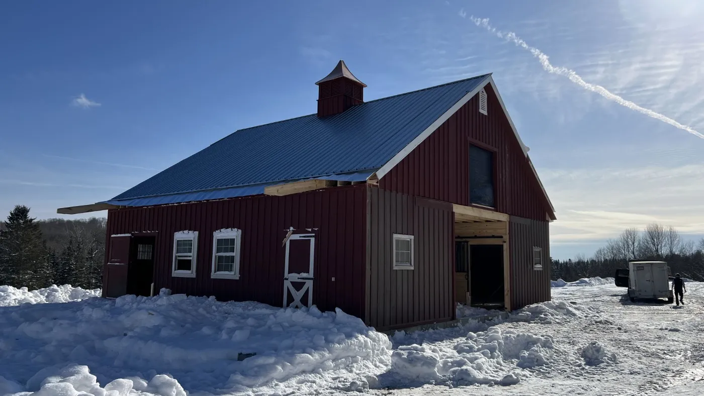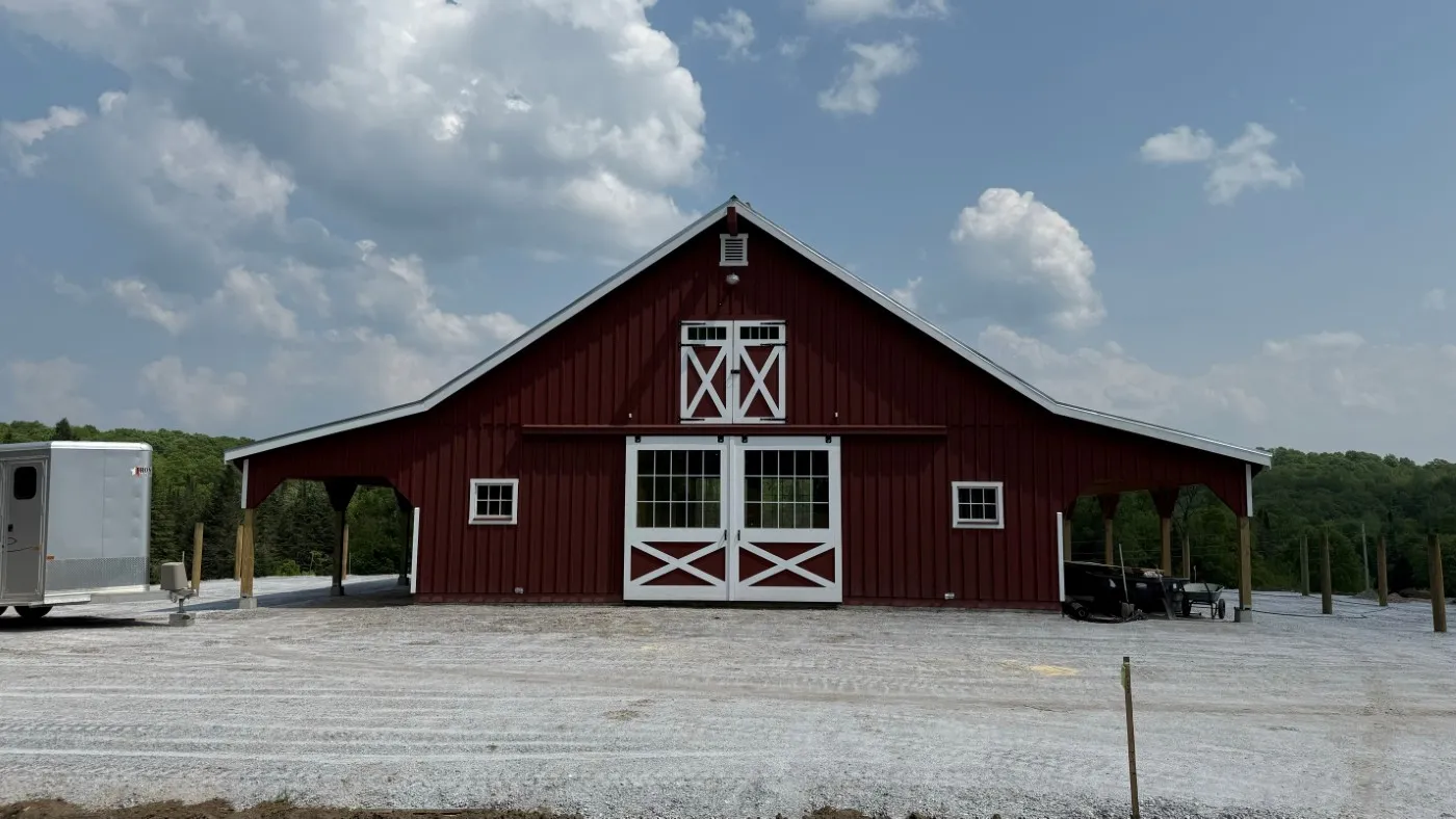 This is a 36'x36' modular horse barn in the high country style with (2) 10' lean-tos. This Cabot, VT horse barn was built with white pine board & batten siding painted with rookwood red paint manufactured by Sherwin Williams. The corner trim and fascia and window trim and door trim and crossbucks are painted ceiling bright white. The roof has 8 pitch rafters and an insulated 28 gauge metal roof (unpainted Galvanized Color) manufactured by A.B. Martin. The smaller windows are sliding wood barn sash windows manufactured by Bird-In-Hand Windows & Doors. The larger windows are insulated double-hung Endure Series windows manufactured by ProVia Windows & Doors. The insulated service doors with window were manufactured by Bird-In-Hand Windows & Doors. The 6'x9' roll doors with windows and 4'x7' dutch doors and service doors and double loft doors with transom windows and gable vents are manufactured by J&N Structures. On the roof is a B-48 Boston Series cupola with horse weather vane manufactured by Creative Cupolas. The foundations are frost walls and partial concrete pad installed by the customer.