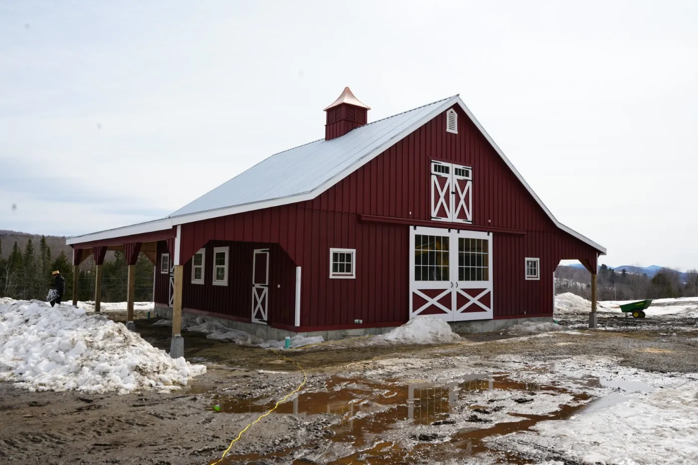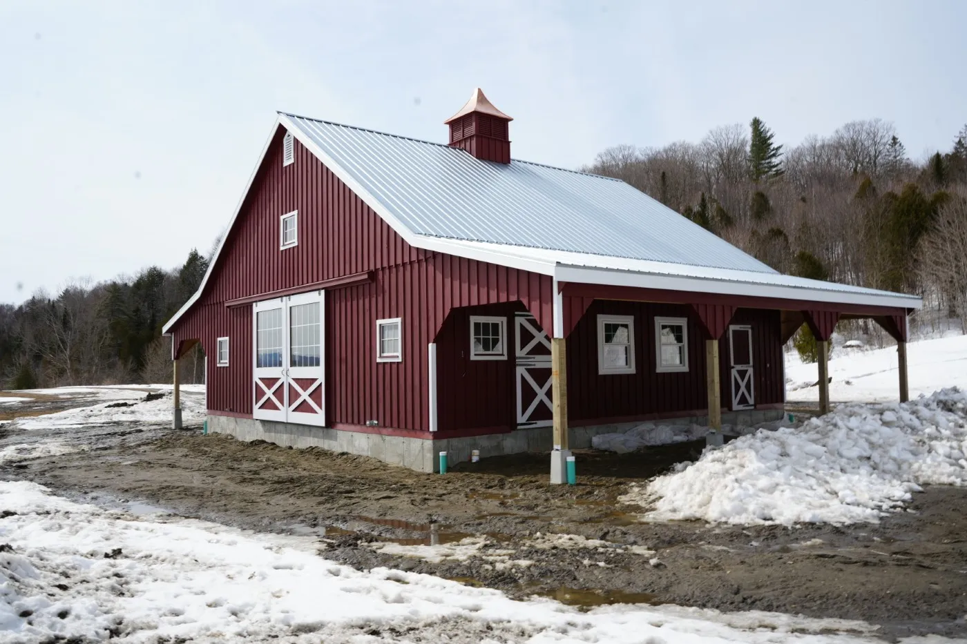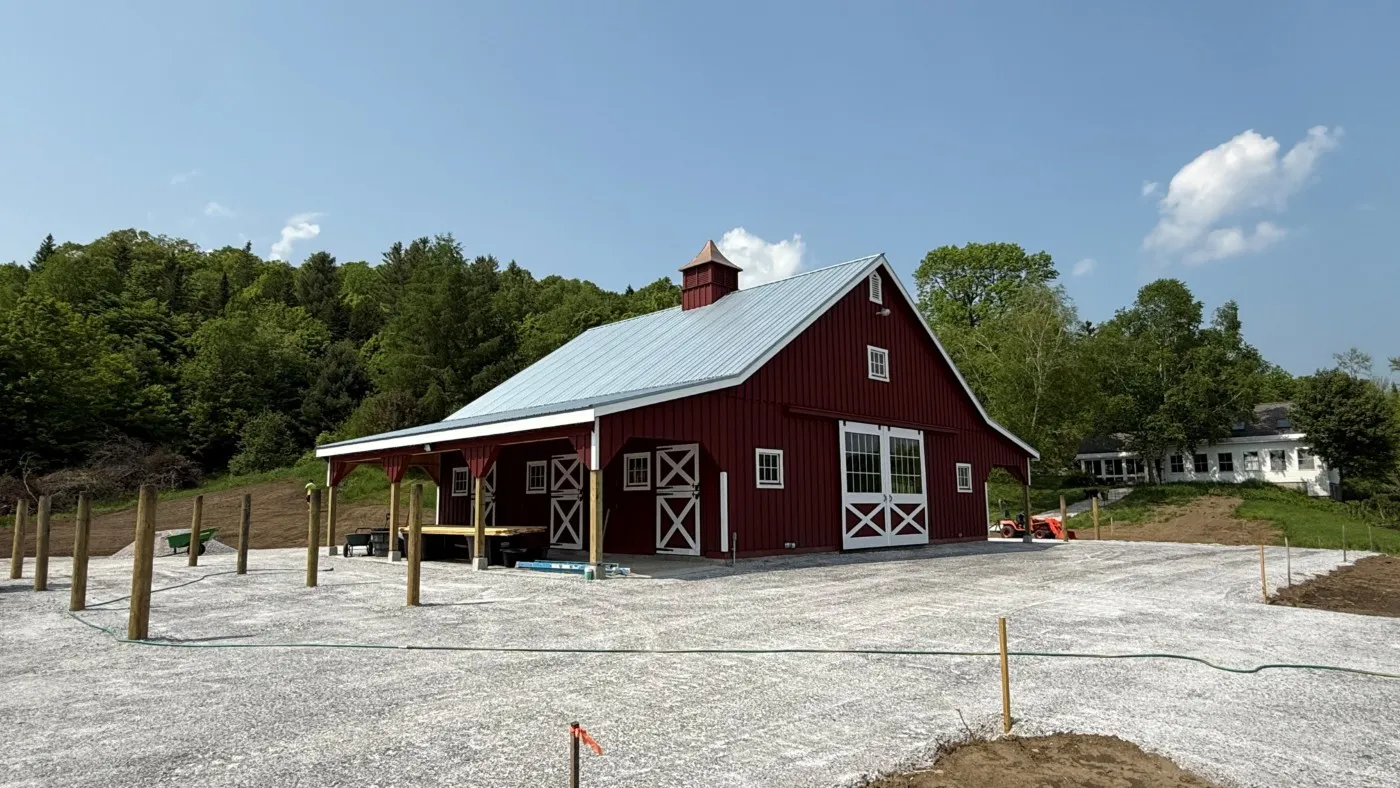 This is a 36'x36' modular horse barn in the high country style with (2) 10' lean-tos. This Cabot, VT horse barn was built with white pine board & batten siding painted with rookwood red paint manufactured by Sherwin Williams. The corner trim and fascia and window trim and door trim and crossbucks are painted ceiling bright white. The roof has 8 pitch rafters and an insulated 28 gauge metal roof (unpainted Galvanized Color) manufactured by A.B. Martin. The smaller windows are sliding wood barn sash windows manufactured by Bird-In-Hand Windows & Doors. The larger windows are insulated double-hung Endure Series windows manufactured by ProVia Windows & Doors. The insulated service doors with window were manufactured by Bird-In-Hand Windows & Doors. The 6'x9' roll doors with windows and 4'x7' dutch doors and service doors and double loft doors with transom windows and gable vents are manufactured by J&N Structures. On the roof is a B-48 Boston Series cupola with horse weather vane manufactured by Creative Cupolas. The foundations are frost walls and partial concrete pad installed by the customer.
