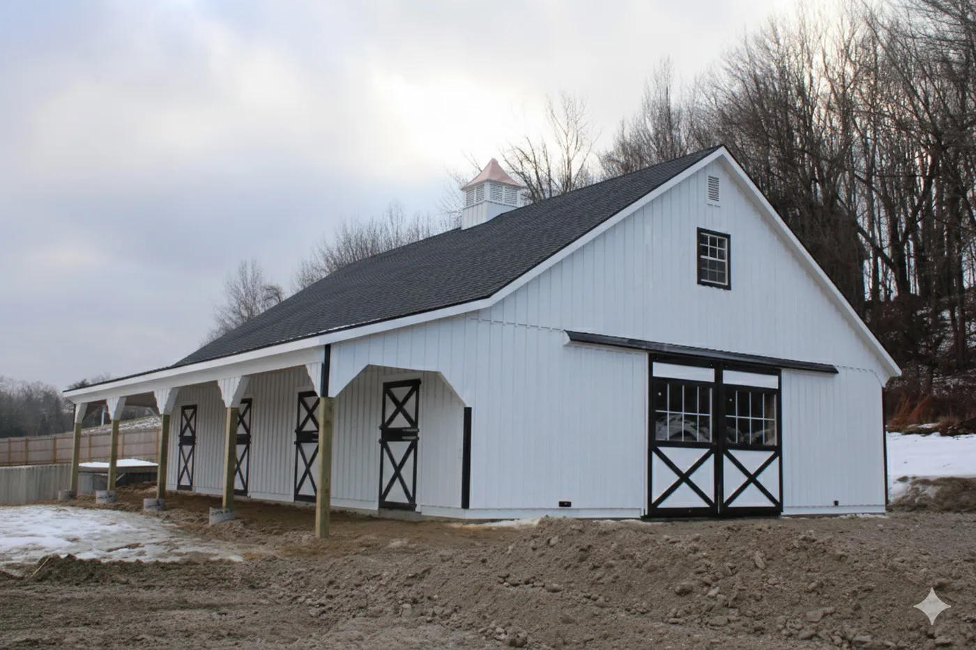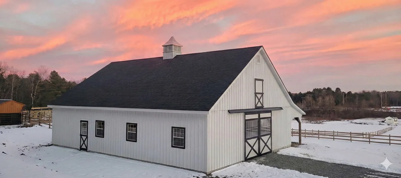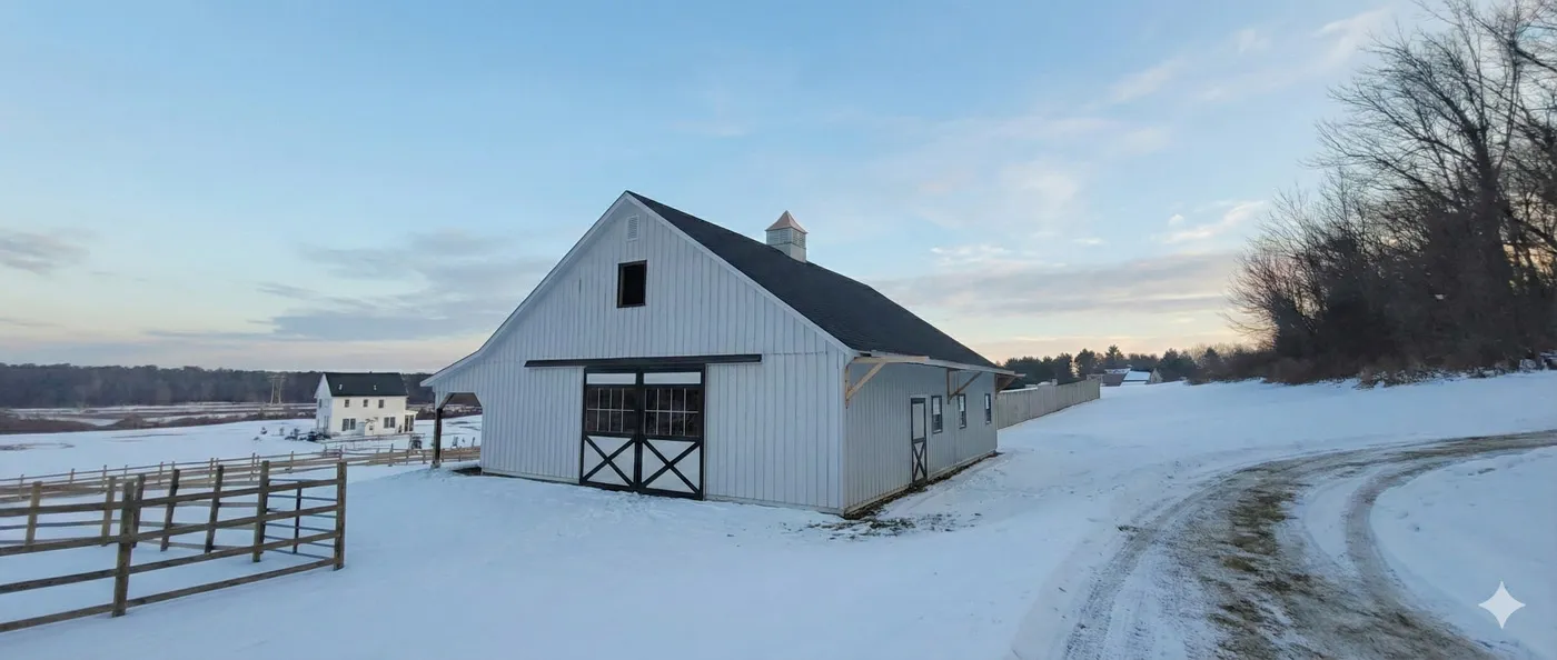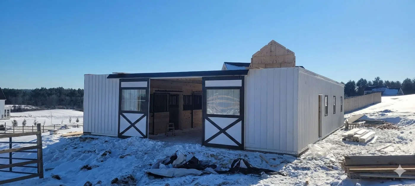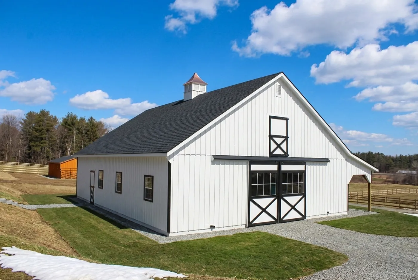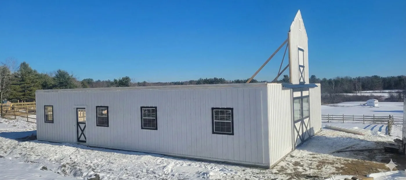 This is a 36'x48' modular horse barn in the High Country style with an 8' open lean-to. This Falmouth, ME horse barn was built with white pine board & batten siding painted with white paint manufactured by PPG. The corner trim and window trim are painted black. The door trim and crossbucks are painted black. The roof has 8 pitch rafters and architectural shingle roof with BP 2-tone black shingles. The 30"x36" vertical sliding aluminum windows with grids are manufactured by Appalachian Woodcrafts. The 4'x7' Dutch doors with 20" hinges and horseshoe latches and 6'x8' roll doors with windows and gable vents are manufactured by Appalachian Woodcrafts. On the roof is a B-42 Boston Series cupola manufactured by Creative Cupolas.