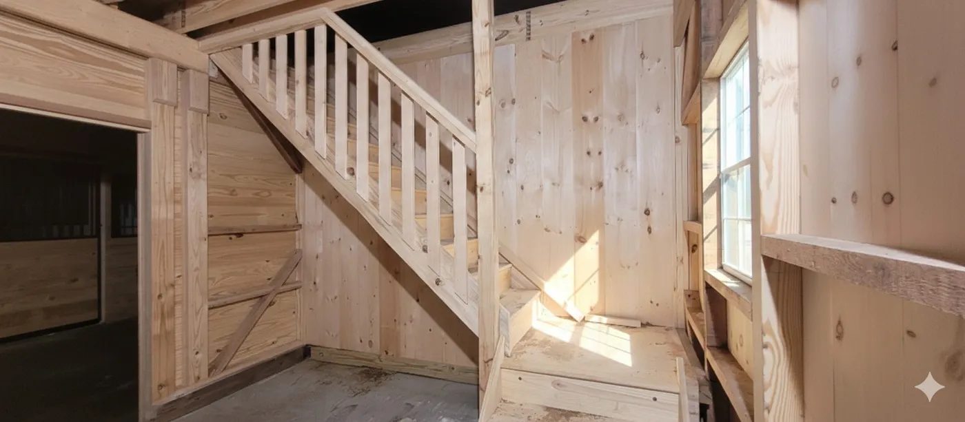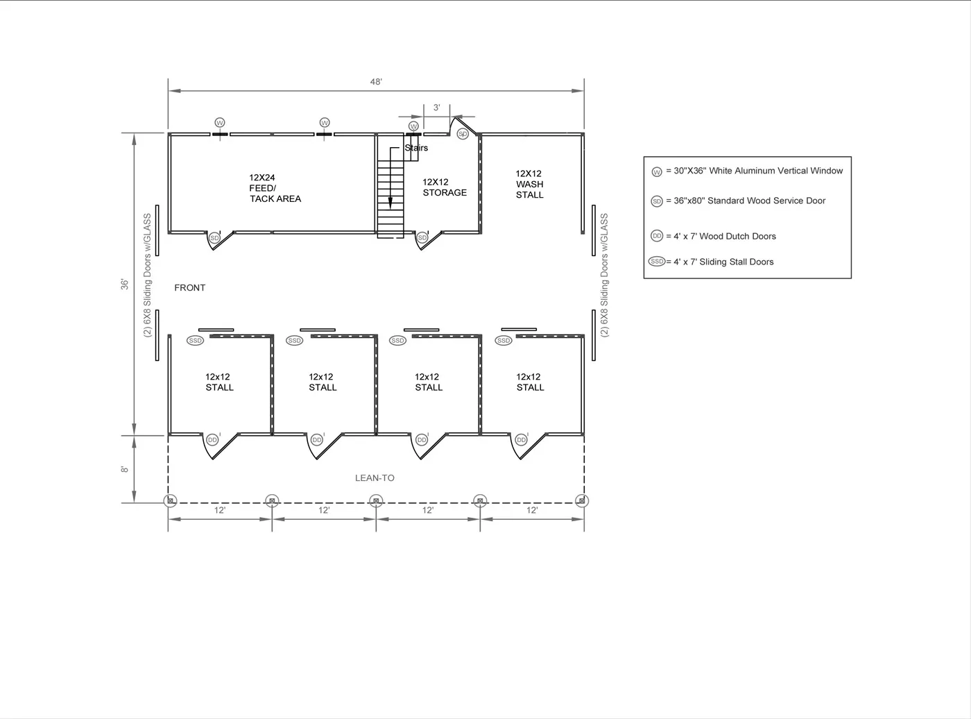 This modular horse barn has (4) 12'x12' stalls and a 12'x12' storage room and a 12'x12' wash stall and a 12'x24' feed/tack room and a 12'x48' center aisle. The barn has a loft accessed via 36" wide L-shaped stairs. Each gable end of the loft has a screened gable vent. The loft has a door and a window. The stalls are lined with 4' high oak kick boards and have standard grills on stall fronts and partitions with southern yellow pine tongue and groove stall fronts and a sliding stall door into the center aisle and a Dutch door with window to the outside. The storage room has floor and (1) wood service door and a window. The wash stall has white glass boards on the walls and is open to the center aisle. The feed/tack room has a 36"x80" service door and (2) windows. The center aisle has (2) 6'x8' sliding doors with windows at each end.