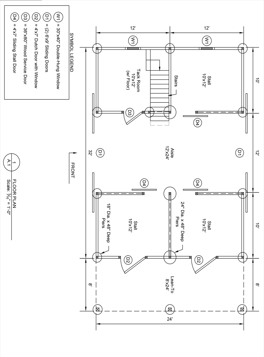 This modular horse barn has (3) 10’x12’ stalls and a 10’x12’ tack room and a 12’x24’ center aisle. It has a full loft accessed via stairs in the tack room. Each end of the loft has a swinging loft door and, up near the peak, is a gable vent. The stalls are lined with 4’ high oak kick boards and have a sliding stall door into the center aisle. (2) stalls have a dutch door with window to the outside. The 3rd stall has an insulated double-hung window. The tack room has floor and an insulated double-hung window and a service door into the center aisle. The center aisle has double sliding doors at each end.