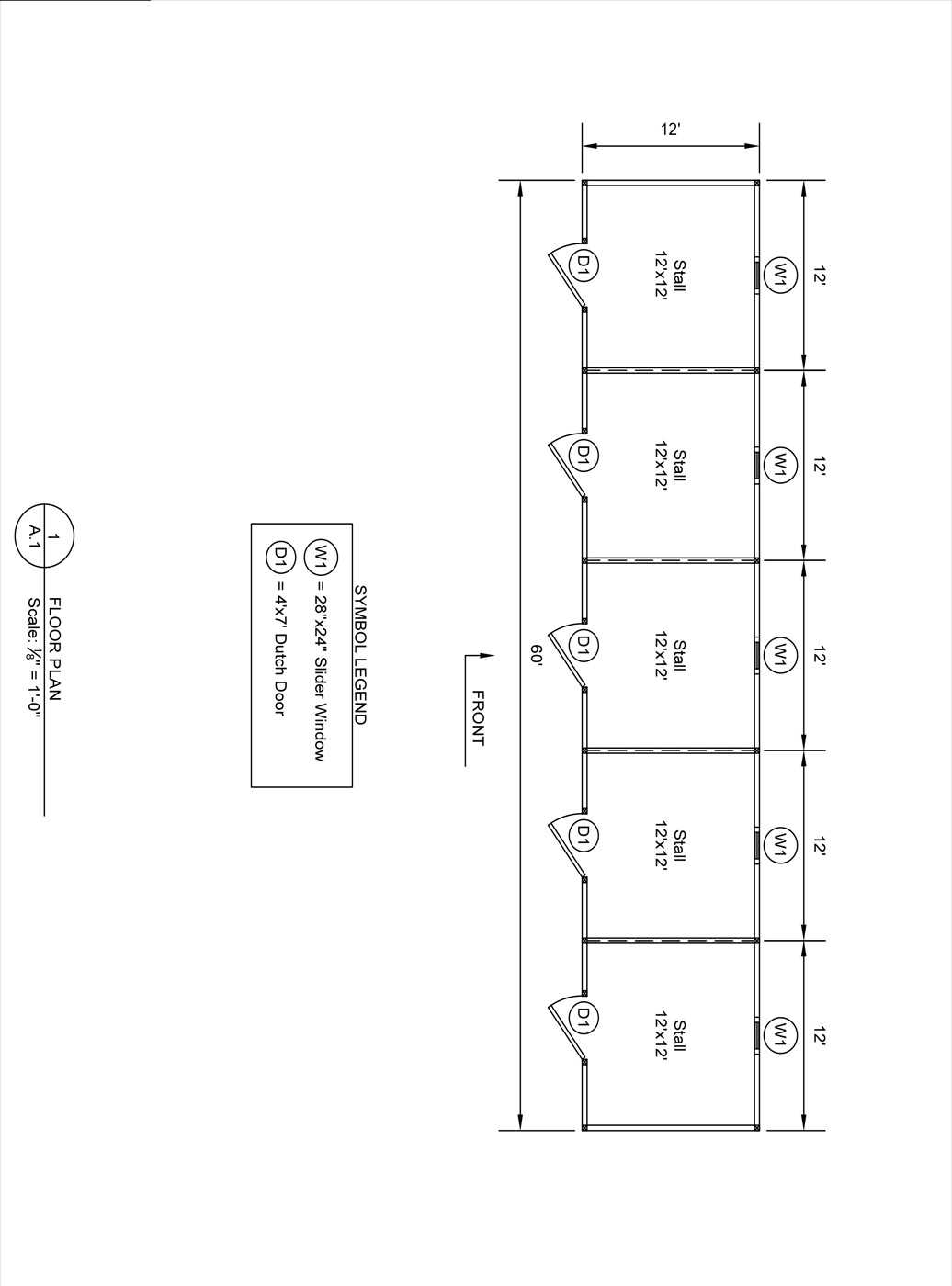 This shed row horse barn has (5) 12'x12' stalls. The stalls are lined with 4' high oak kick boards and have a dutch door in the front and a sliding window in the rear.