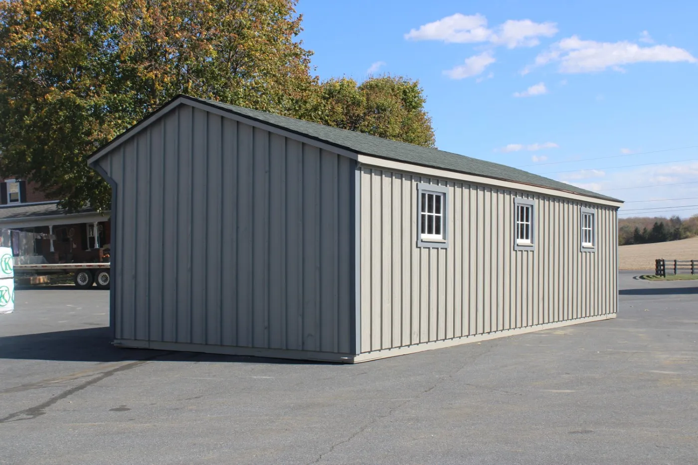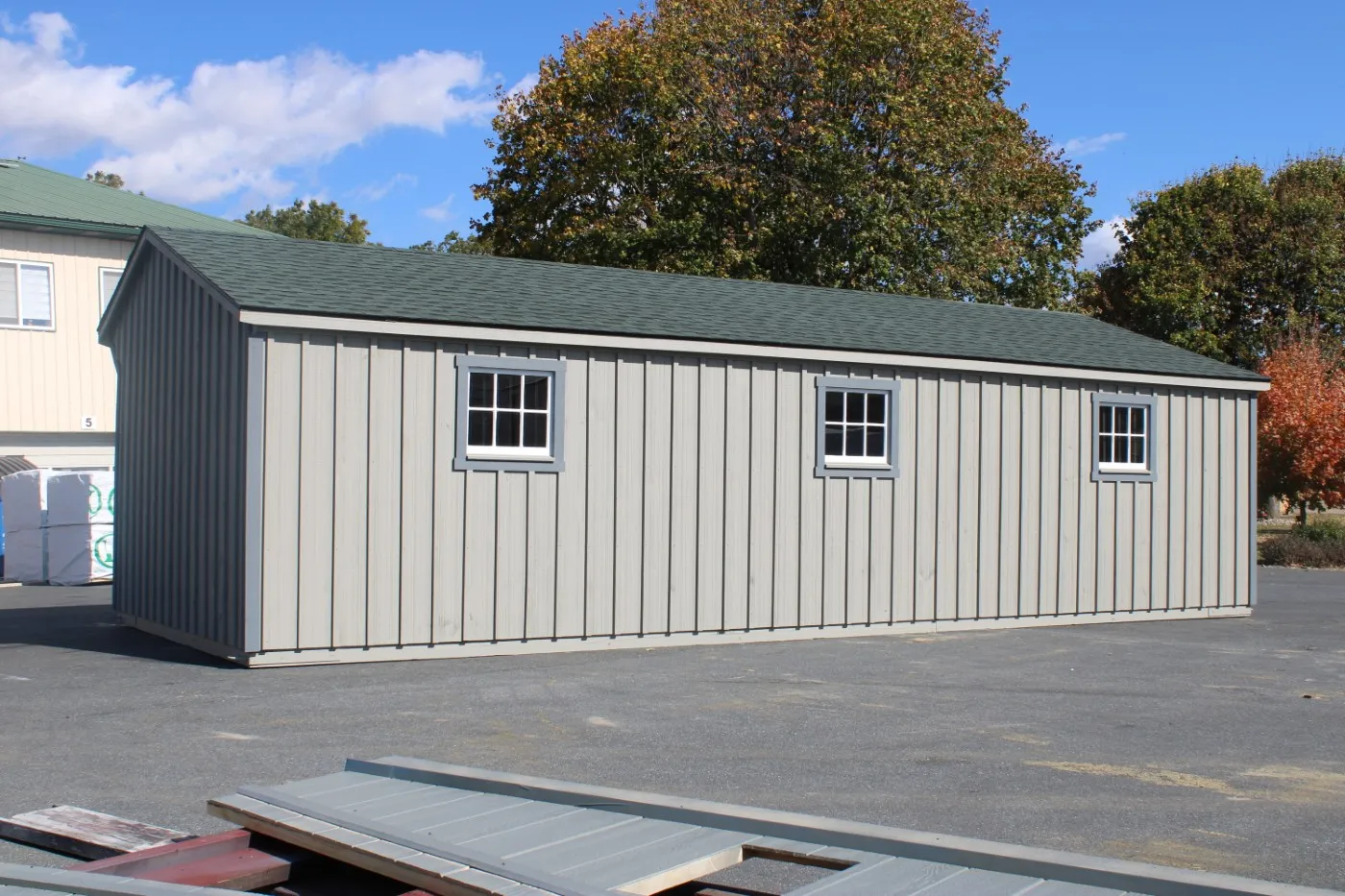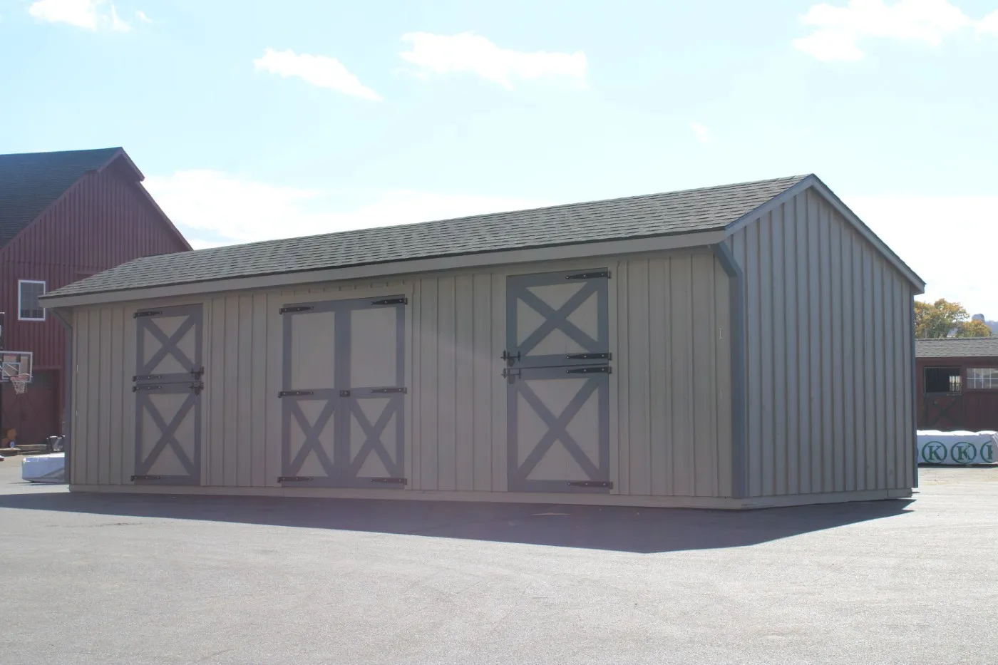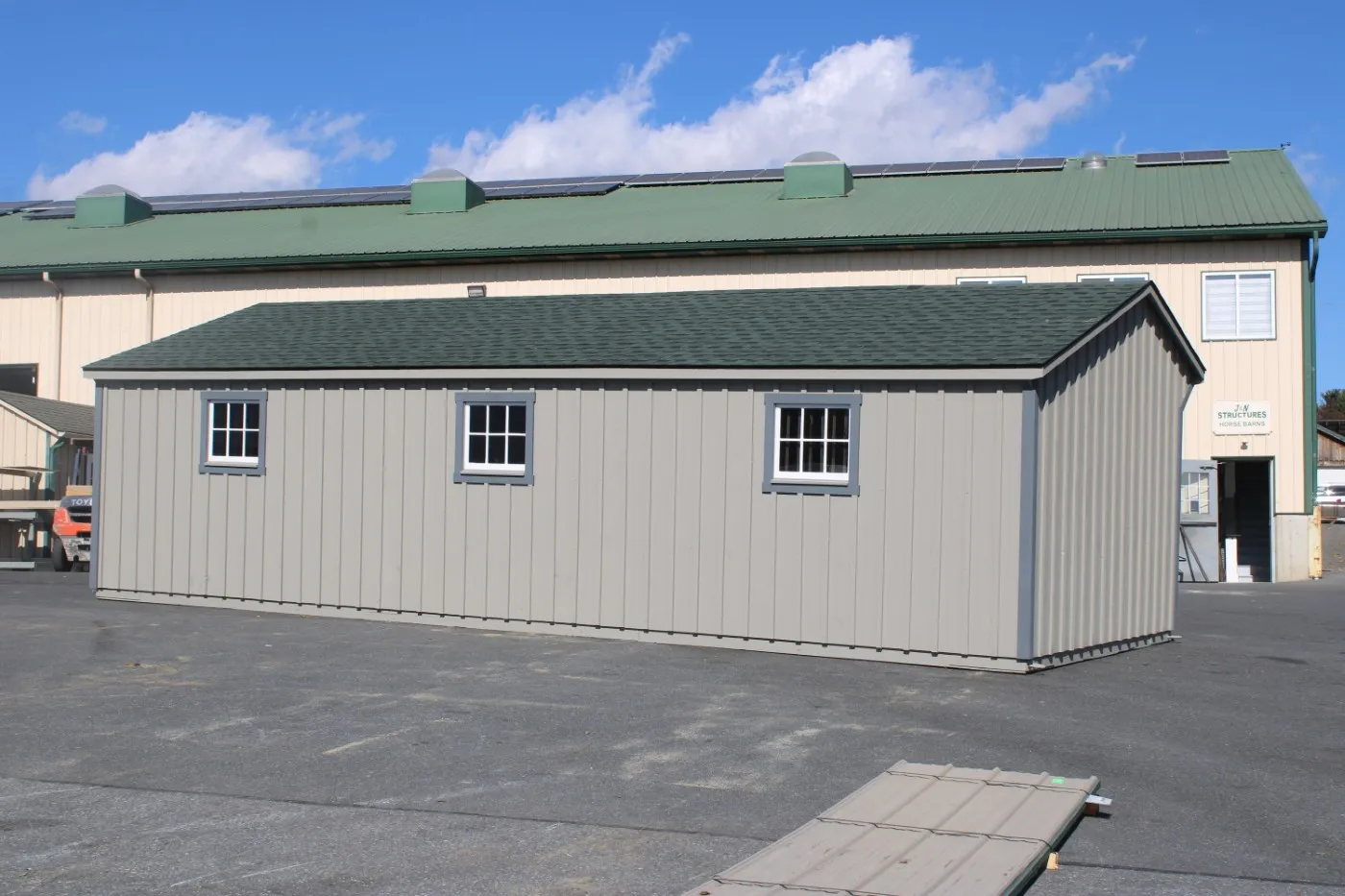 This is a 12'x32' shed row horse barn. This New Holland, PA horse barn was built with white pine board and batten siding painted with clay paint manufactured by Fisher Paints. The corner trim and window trim and door trim and crossbucks are painted dark gray. It has quaker style rafters and architectural shingle roof with GAF Timberline HDZ (Hunter Green color) shingles. The windows are sliding wood barn sash windows manufactured by Bird-In-Hand Windows & Doors. The 4'x7' dutch doors and double service doors are manufactured by J&N Structures.
