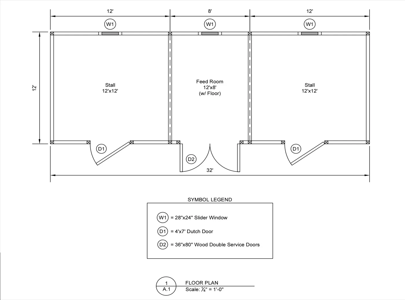 This shed row horse barn has (2) 12'x12' stalls and a 12'x8' feed room. The stalls are lined with 4' high oak kick boards and have a dutch door in the front and a sliding window in the rear. The feed room has floor and double service doors in the front and a sliding window in the rear.
