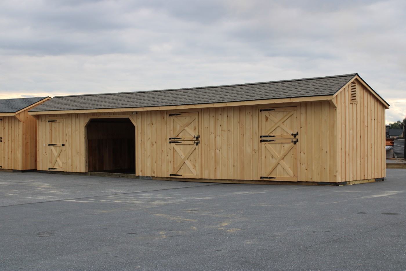 This shed row horse barn has (2) 10'x12' stalls and a 10'x12' run-in and a 10'x8' tack room. The stalls are lined with 4' high oak kick boards and have a dutch door in the front and a sliding window in the rear. The run-in area is lined with 4' high oak kick boards and has a drop vent in the rear. The tack room has floor and a service door in the front and a sliding window in the rear. On each end of the barn, up near the peak, are gable vents.