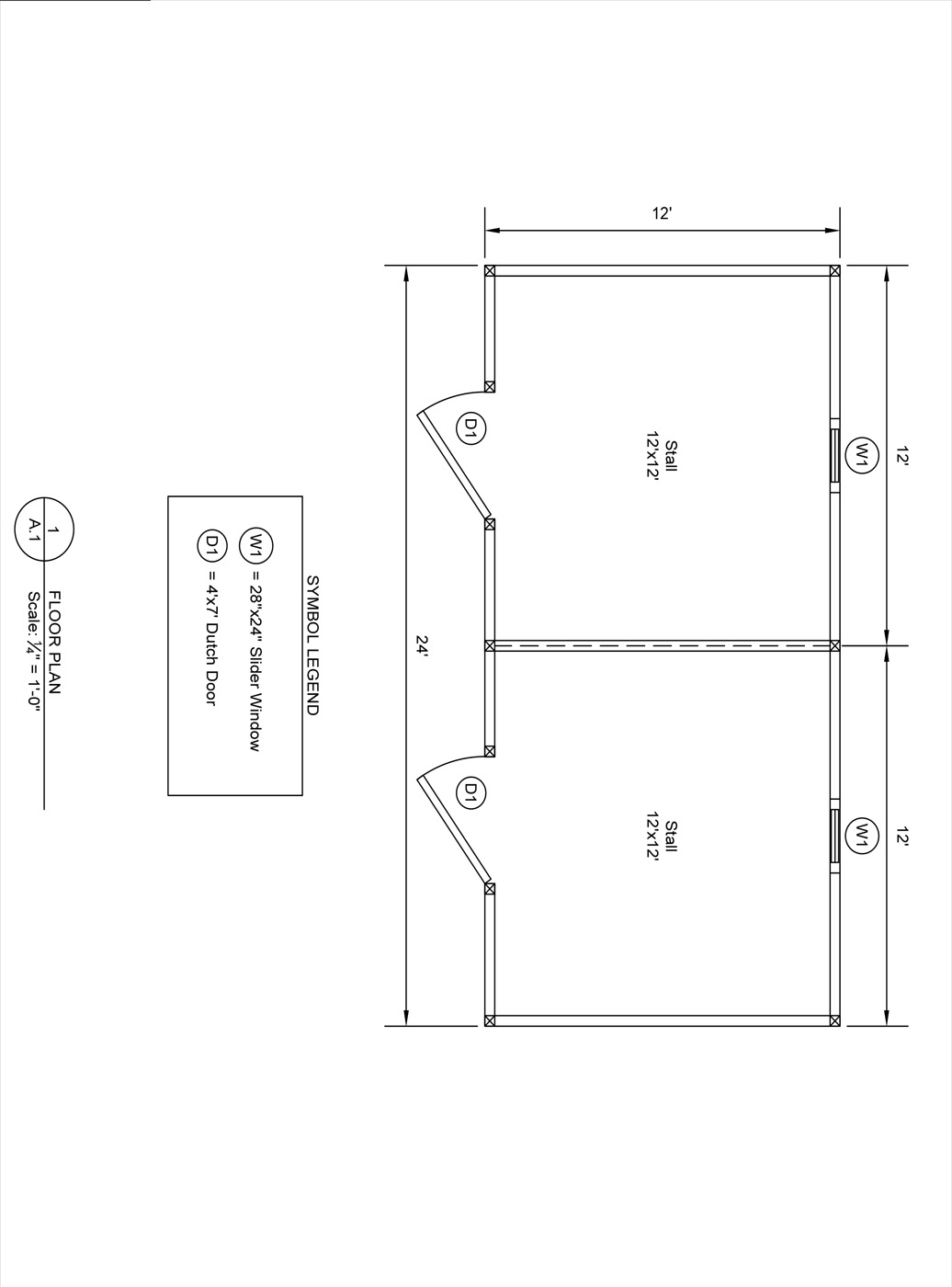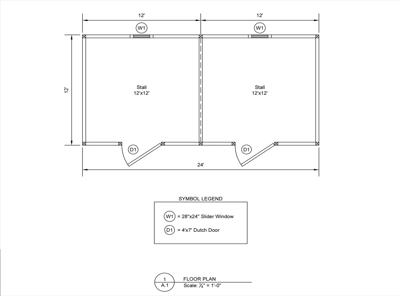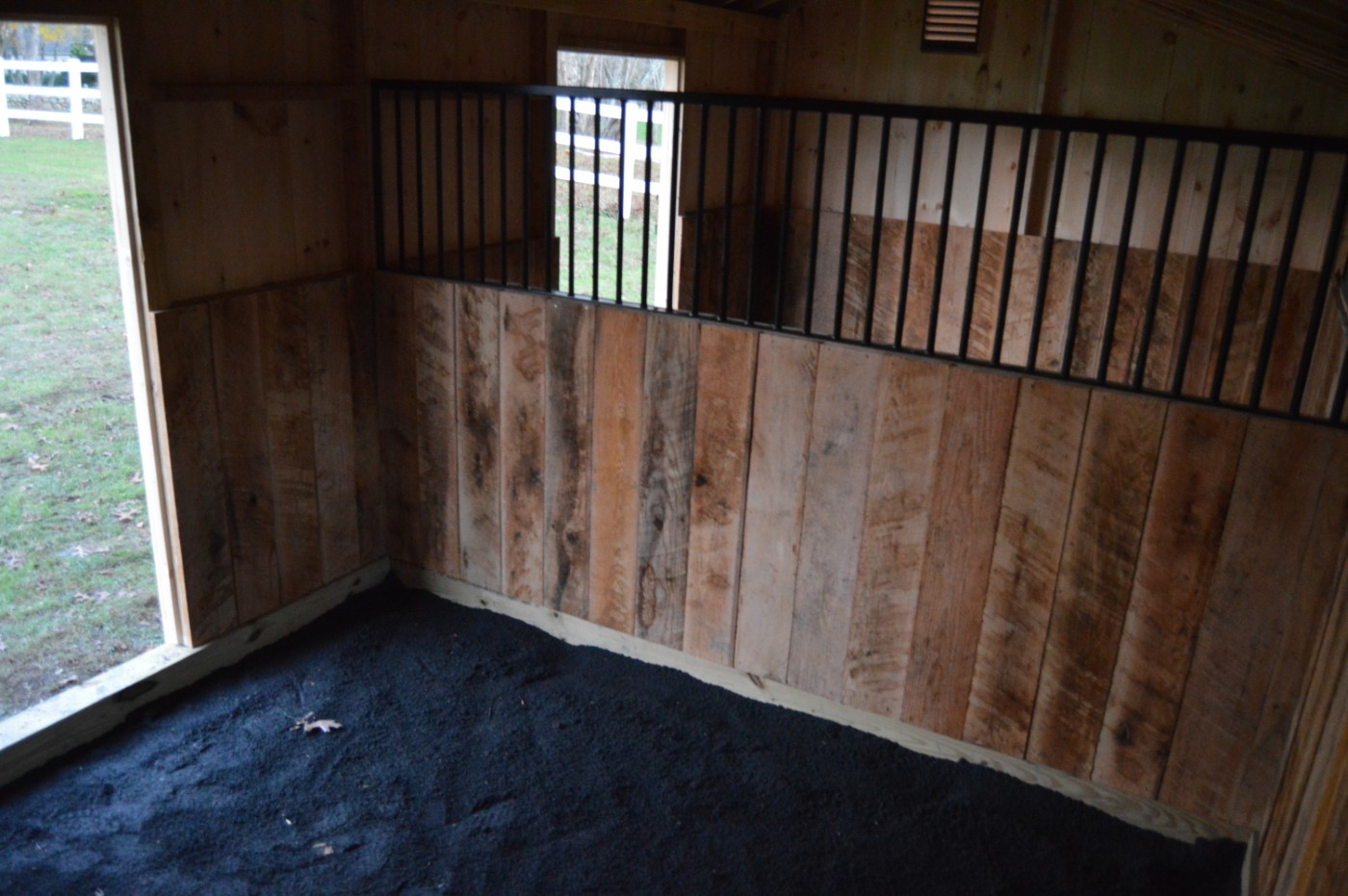 This shed row horse barn has (2) 12'x12' stalls. The stalls are lined with 4' high oak kick boards and have a dutch door in the front and a sliding window in the rear. On each end of the barn, up near the peak, are gable vents.
