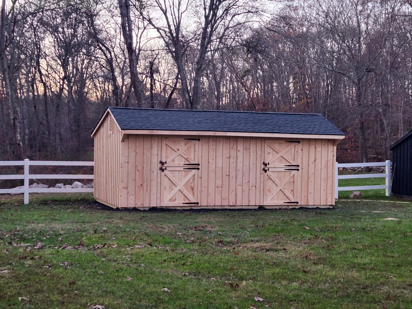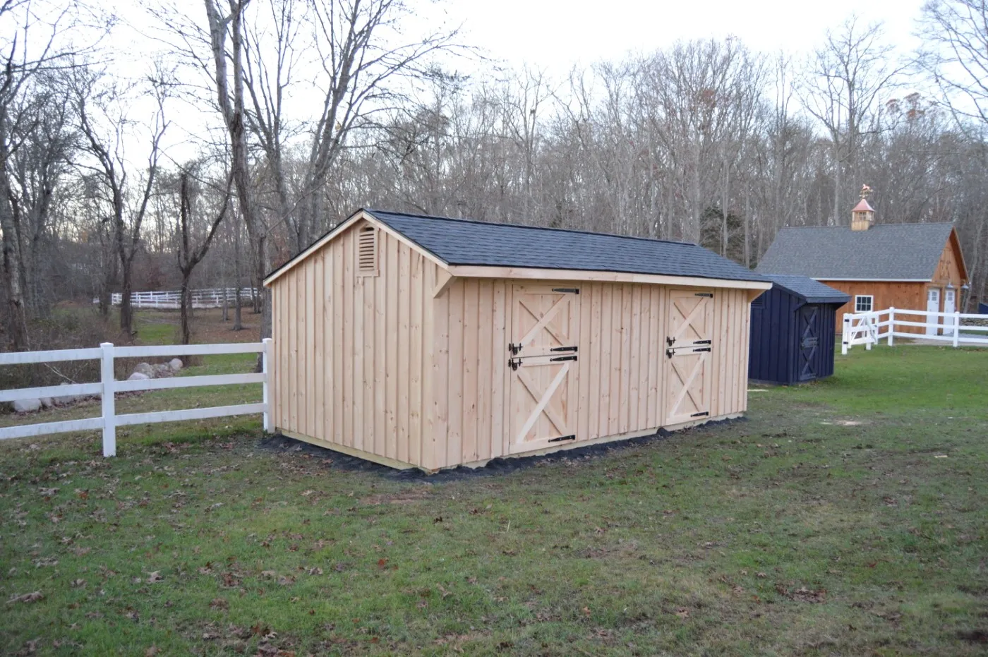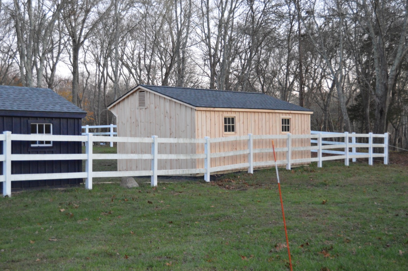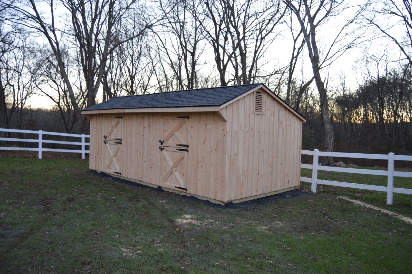 This is a 12'x24' shed row horse barn. This South Kingstown, RI horse barn was built with white pine board and batten siding. It has quaker style rafters and an architectural shingle roof with GAF Timberline HDZ (Pewter Gray color) shingles. The windows are sliding wood barn sash windows manufactured by Bird-In-Hand Windows & Doors. The 4'x7' dutch doors and gable vents are manufactured by J&N Structures.