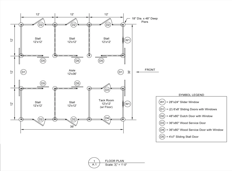 This modular horse barn has (5) 12’x12’ stalls and a 12’x12’ tack room and a 12’x36’ center aisle. The stalls are lined with 4’ high oak kick boards and have a sliding stall door into the center aisle and a dutch door with window to the outside. The tack room has floor and a service door with window to the outside and a service door into the center aisle. The center aisle has double sliding doors with windows at each end. In the front, are extra sliding windows on either side of the sliding doors. On each end, up near the peak, is a gable vent.