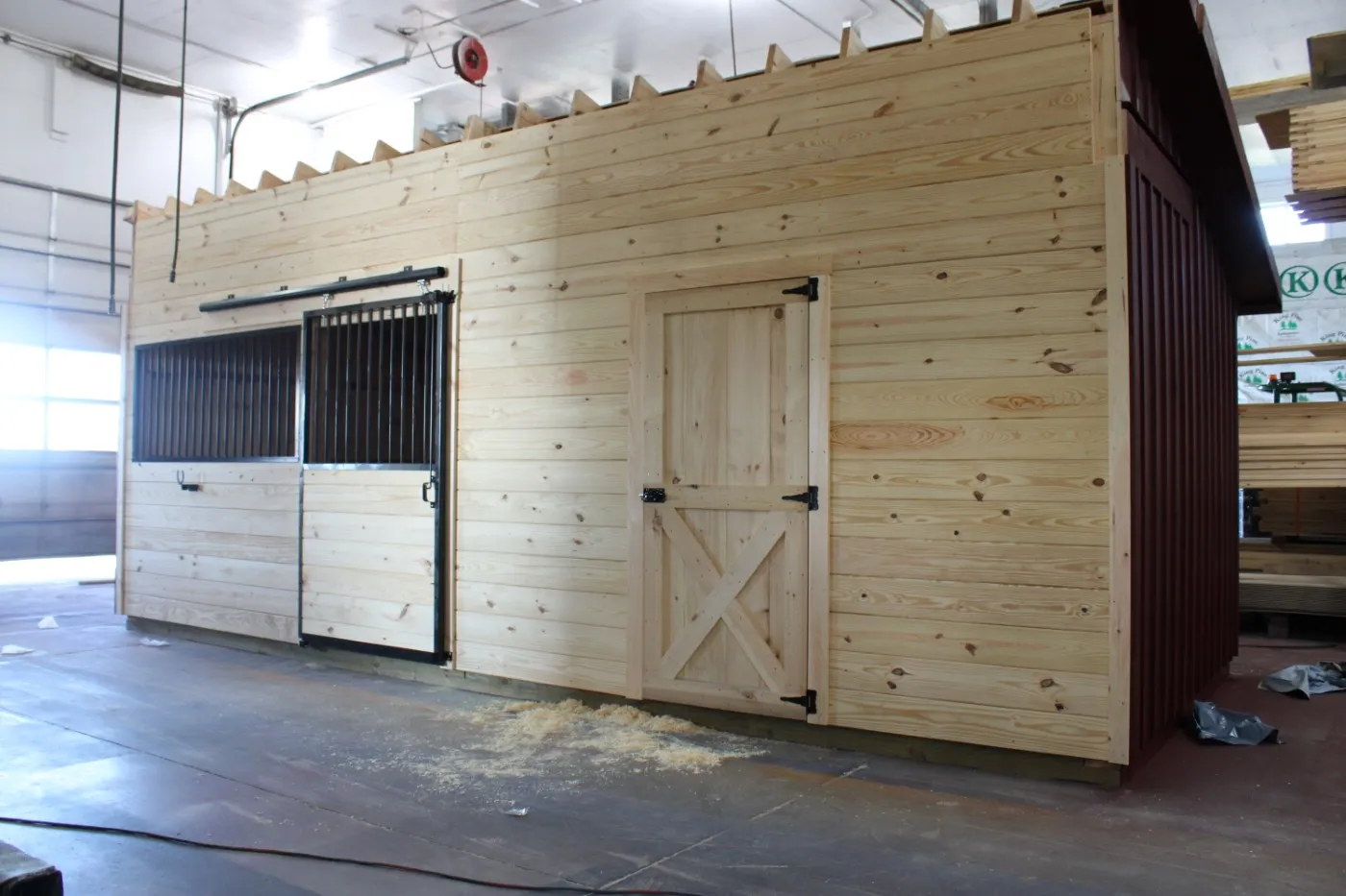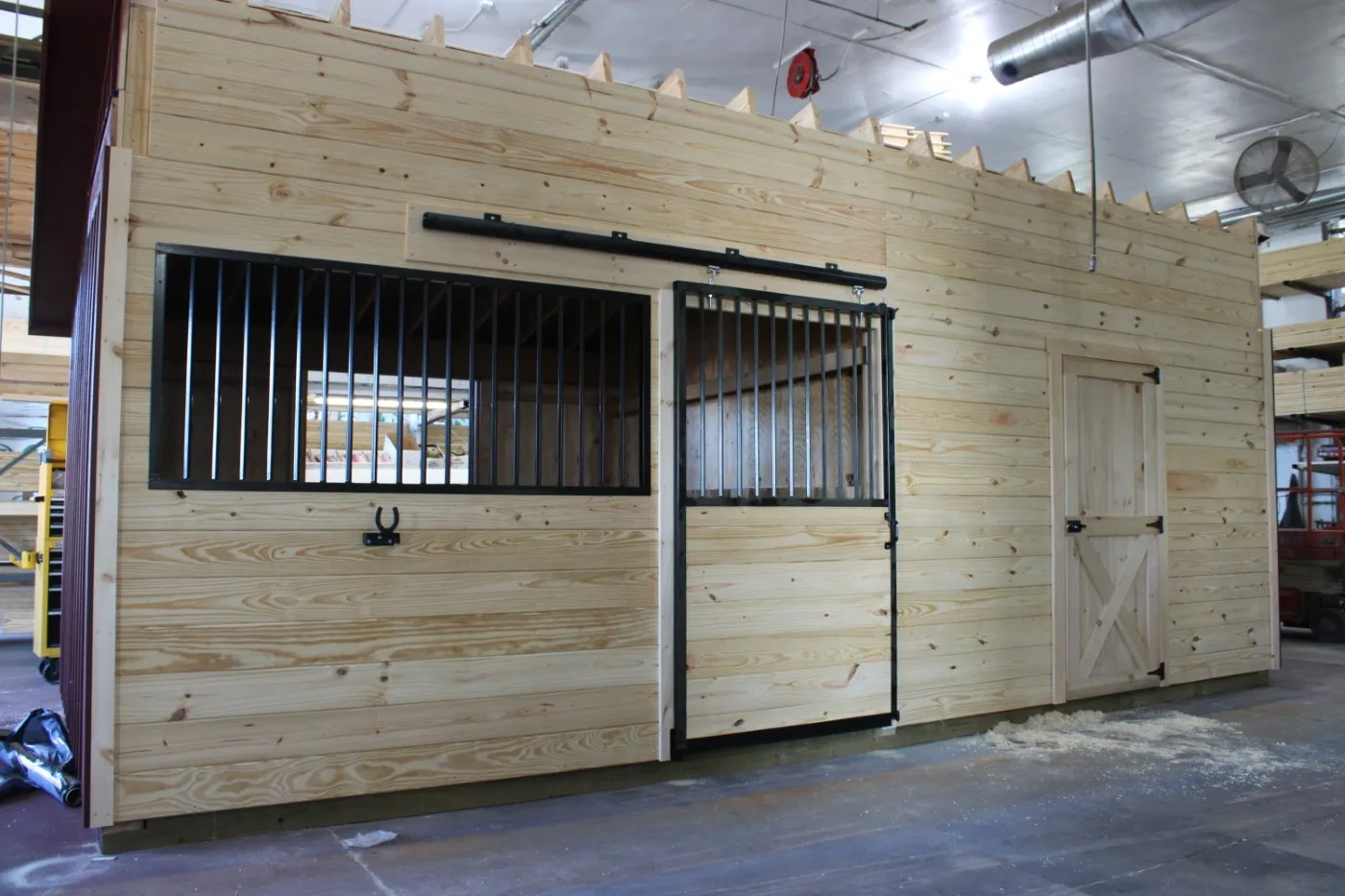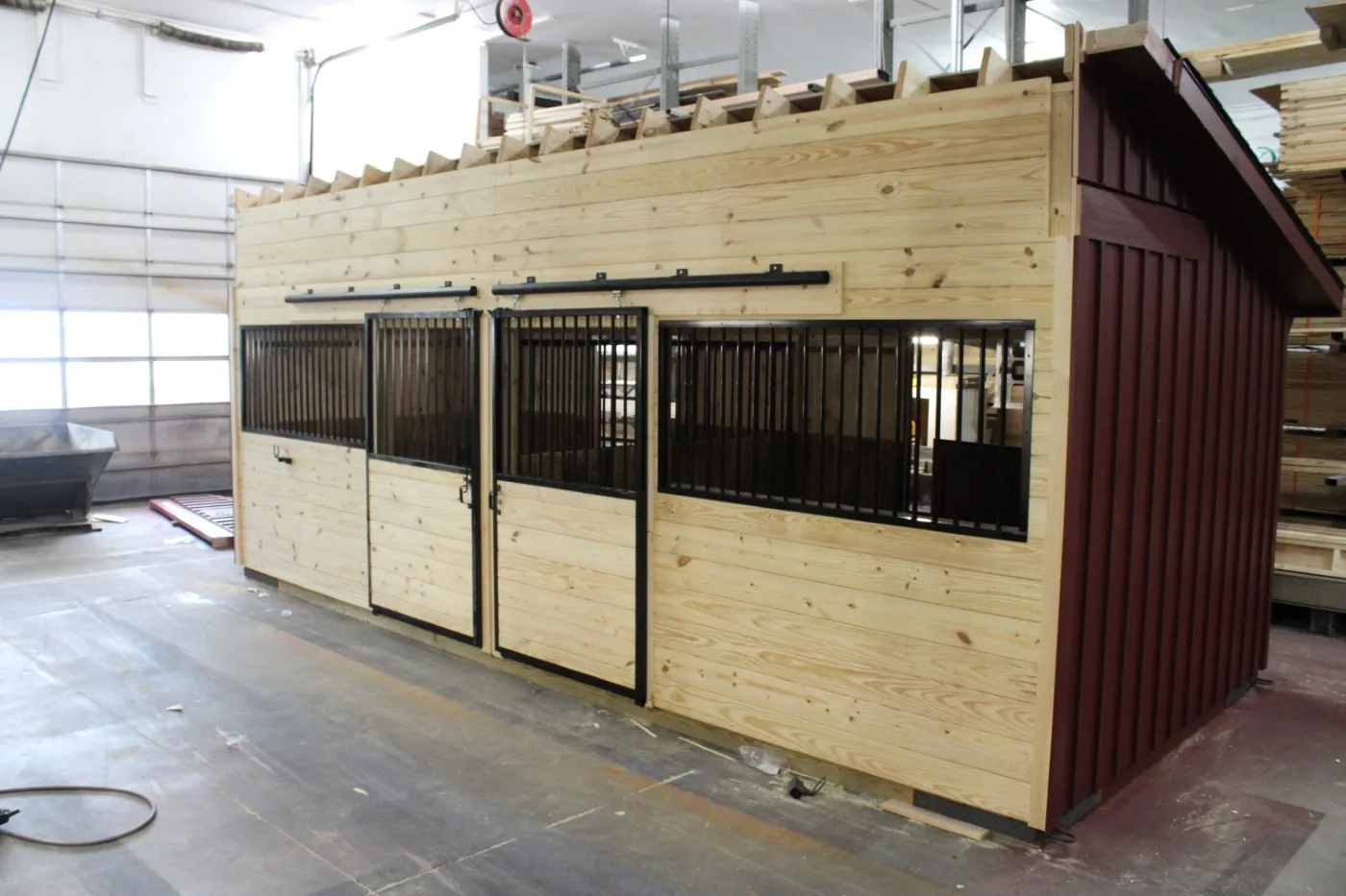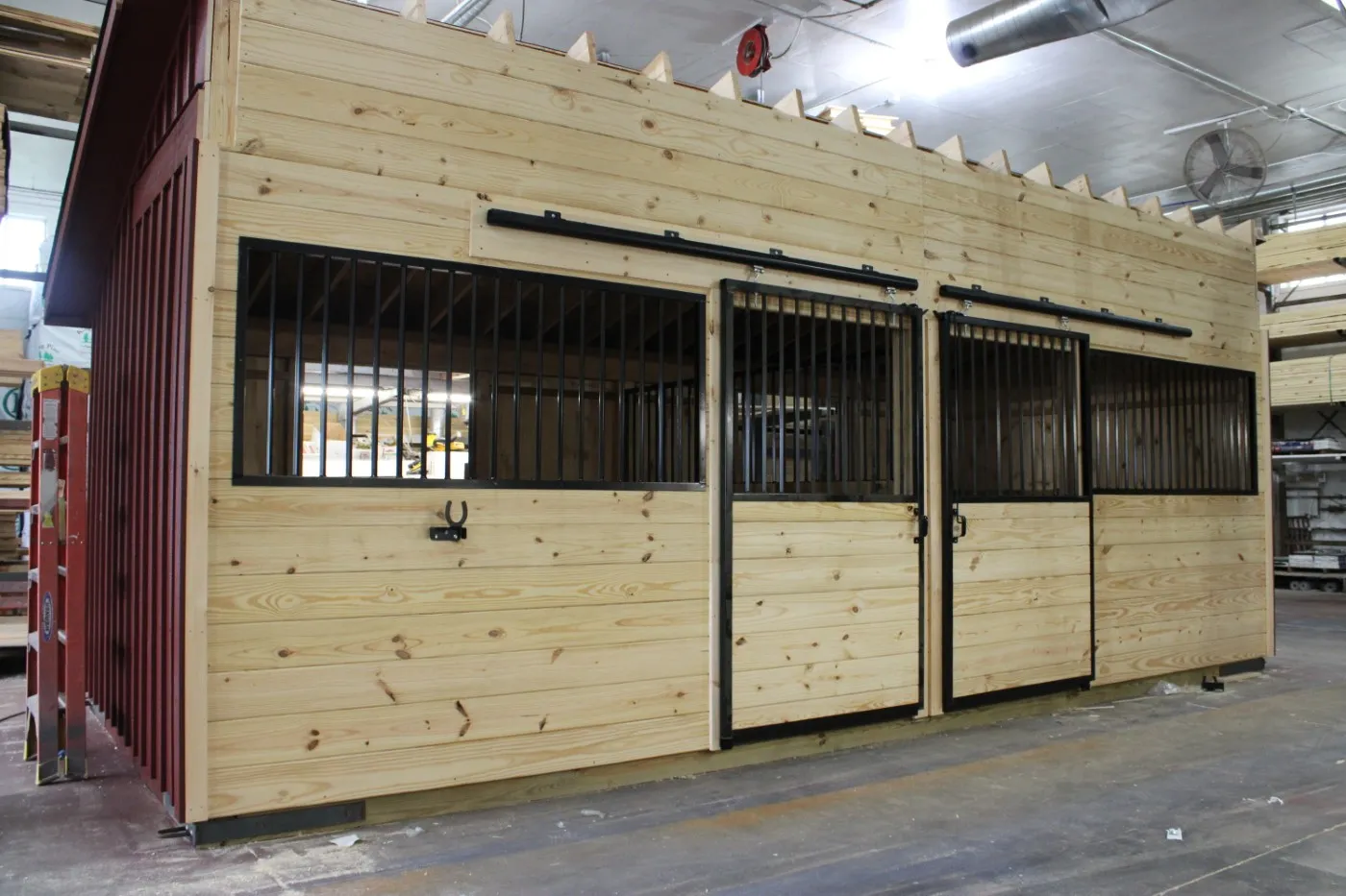 This modular horse barn has (3) 10'x12' stalls and a 10'x12' tack room and a 10'x24' center aisle. The stalls are lined with 4' high oak kick boards and have a sliding stall door into the center aisle and a dutch door with window to the outside. The tack room has floor and a sliding window and a service door into the center aisle. The center aisle has double sliding doors with windows at each end. On each end of the barn, up near the peak, is a gable vent.