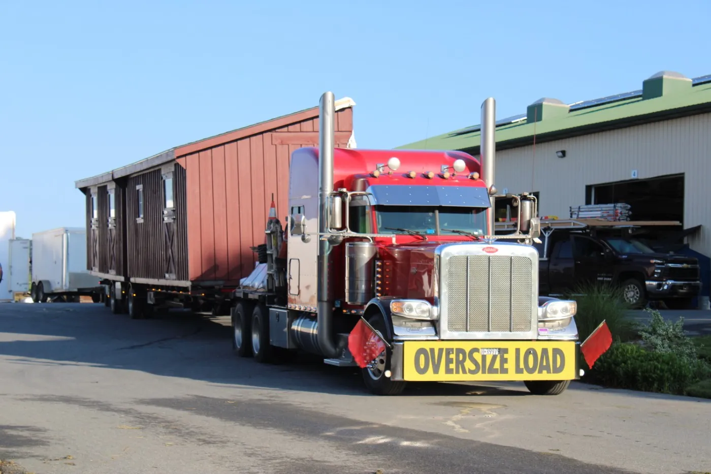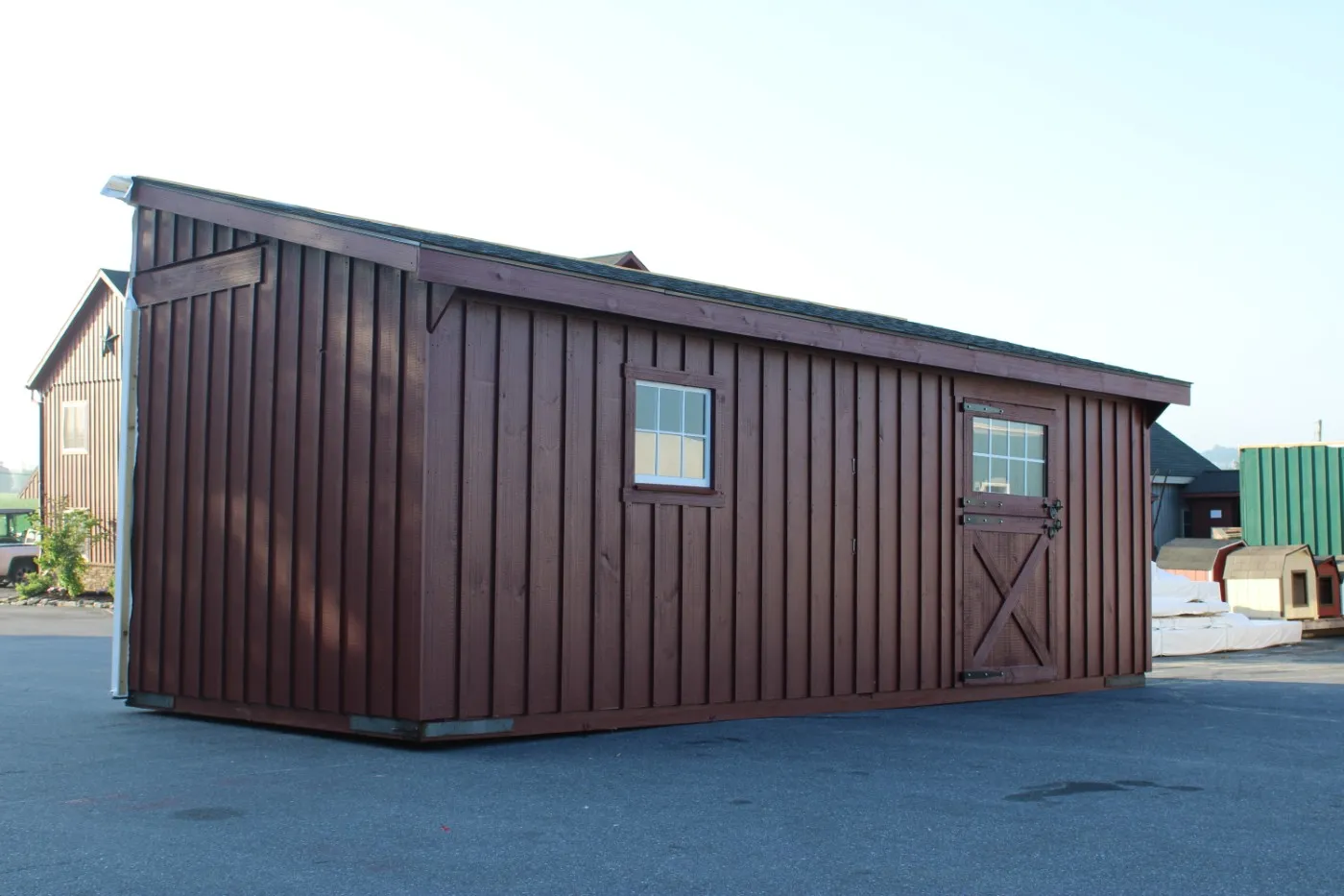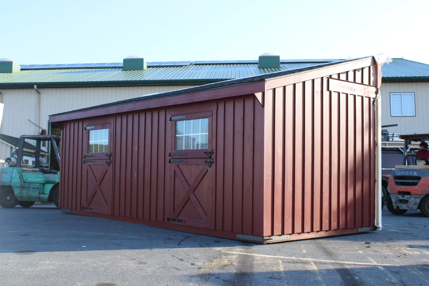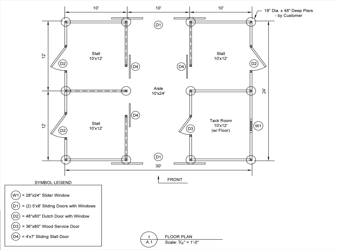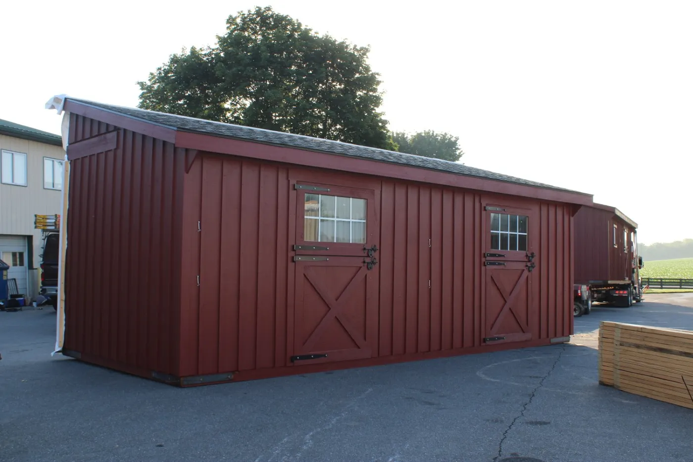 This modular horse barn has (3) 10'x12' stalls and a 10'x12' tack room and a 10'x24' center aisle. The stalls are lined with 4' high oak kick boards and have a sliding stall door into the center aisle and a dutch door with window to the outside. The tack room has floor and a sliding window and a service door into the center aisle. The center aisle has double sliding doors with windows at each end. On each end of the barn, up near the peak, is a gable vent.