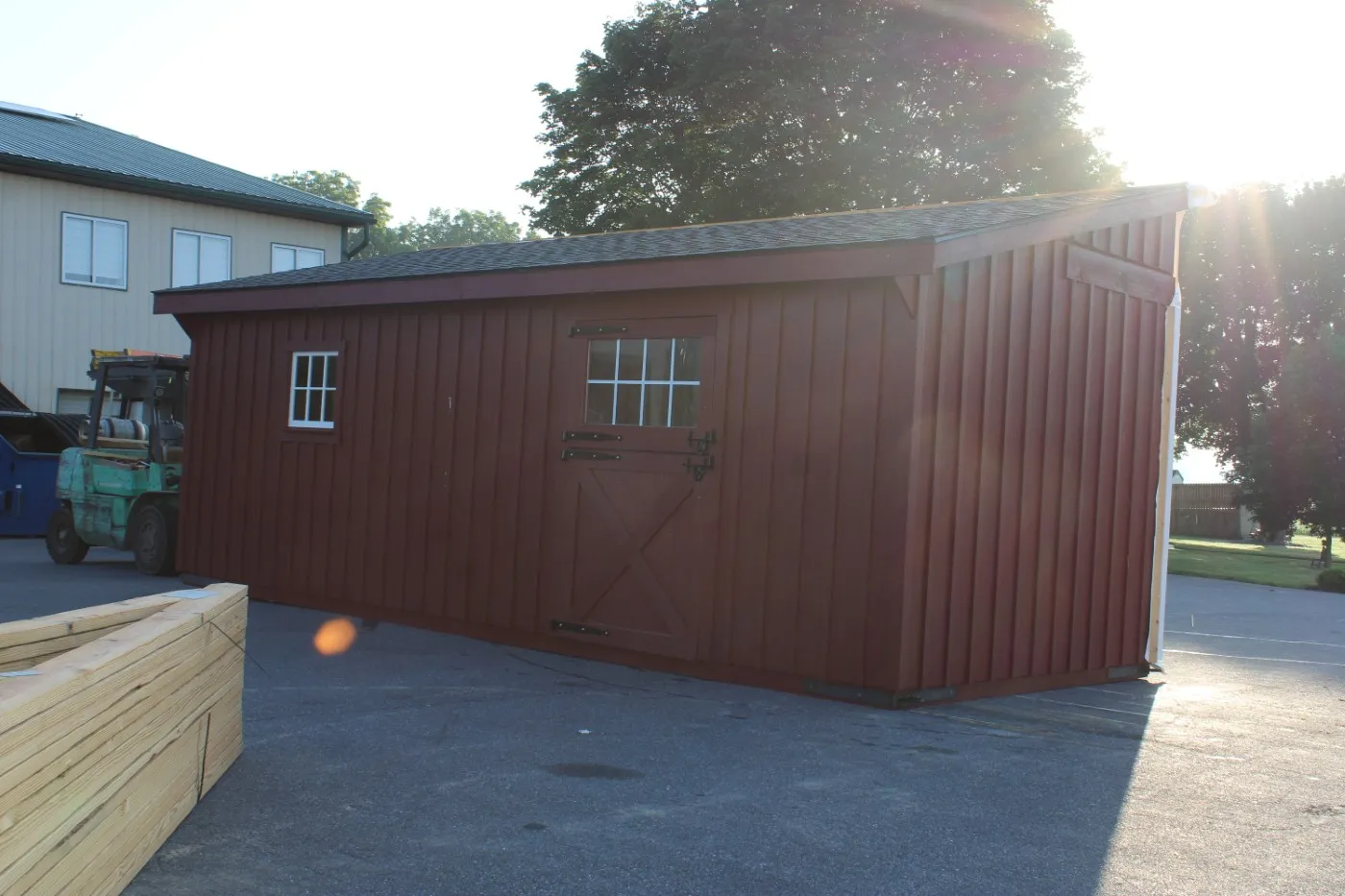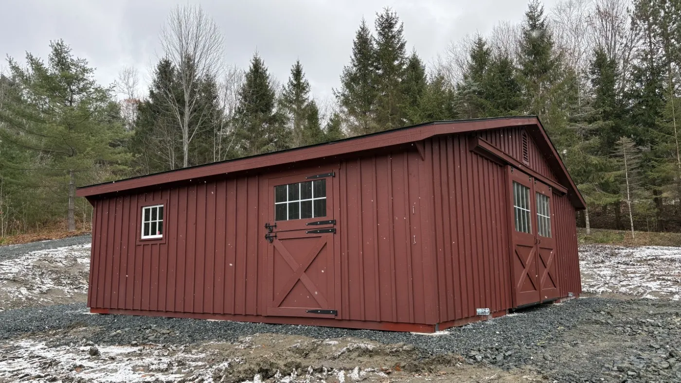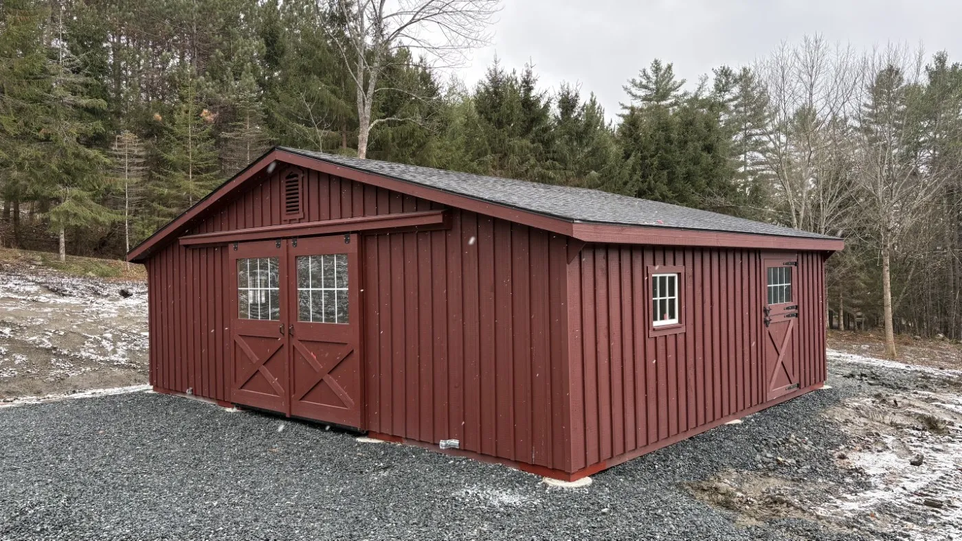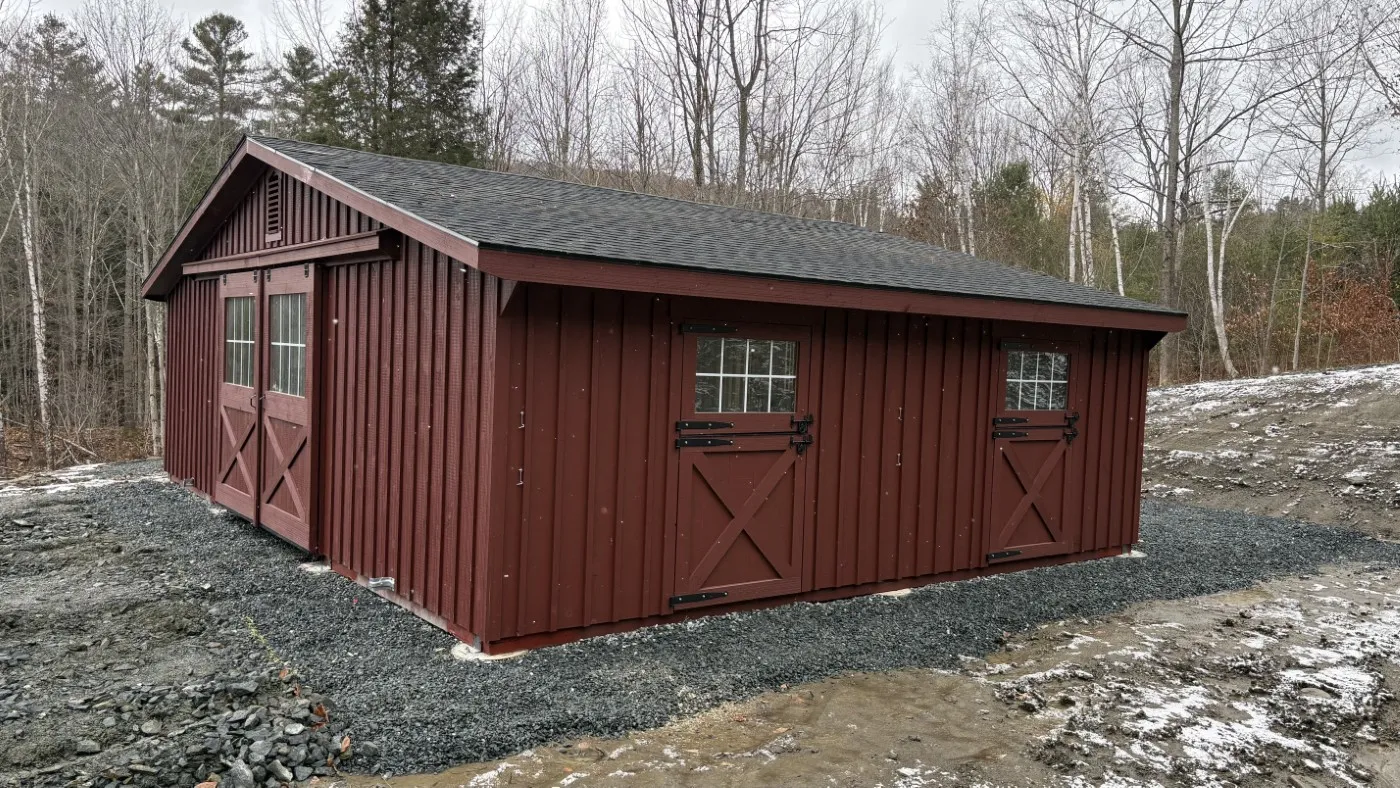 This is a 30'x24' modular horse barn in the trailside style. This North Pomfret, VT horse barn was built with white pine board & batten siding painted with red paint manufactured by Fisher Paints. The roof has 3 pitch rafters and architectural shingle roof with GAF Timberline HDZ (Charcoal color) shingles. The windows are sliding wood barn sash windows manufactured by Bird-In-Hand Windows & Doors. The 5'x8' roll doors with windows and 48"x80" dutch doors with window and service door and gable vents are manufactured by J&N Structures.