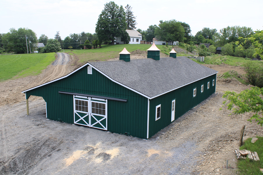 The roof is finished with BP Antique Slate architectural shingles and vented with both a gable vent and a ridge vent. Three cupolas, crafted by Creative Cupolas, crown the roofline, with the center cupola topped by a polished horse weather vane. The barn includes insulated double-hung EN600 windows from Pro-Via. Stall windows are upgraded to wood Dutch doors with windows on one side and a half Dutch door with a window on the other. The 6’x8’ roll doors feature glass panels with grids. All doors were crafted by Appalachian Woodcrafts in Mill Hall, PA.