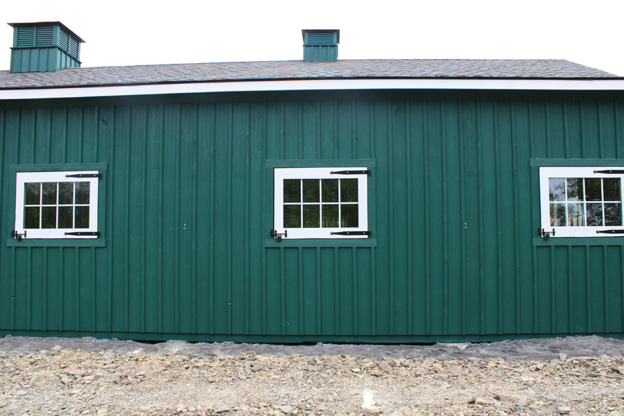 This Trailside style modular barn, located in Saugerties, NY, features white pine board-and-batten siding painted in Sherwin-Williams Hunt Club Green. The corner trim, rake board, face board, window trim, gable vent trim, door trim, and door crossbucks are all painted in Sherwin-Williams Ceiling Bright White. A raised peak over the center aisle enhances the barn’s profile and adds distinctive architectural character.