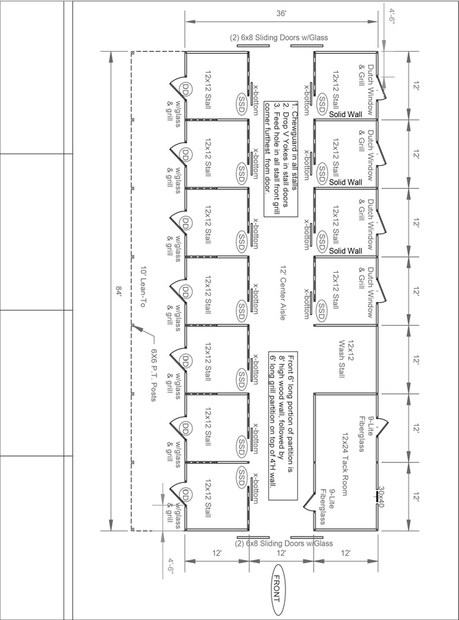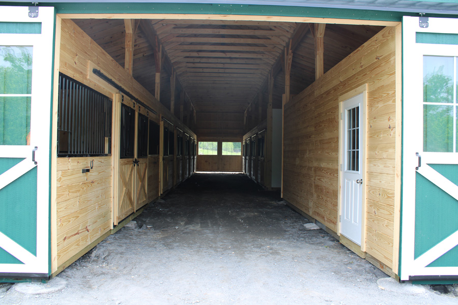 - (11) 12’x12’ stalls with 4’ high oak kick boards and chew guards