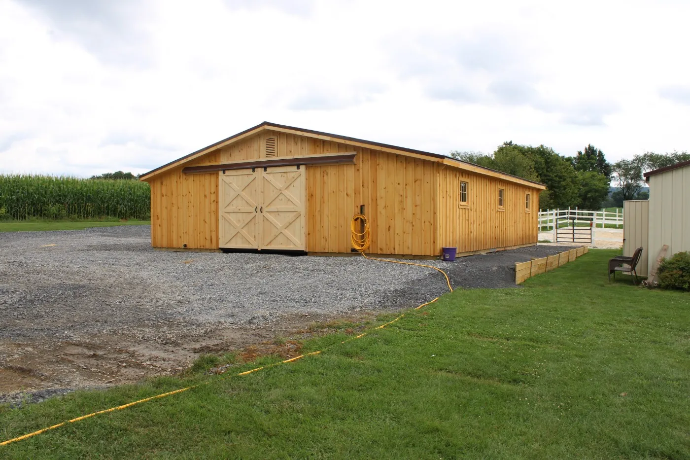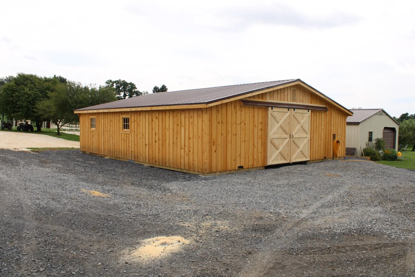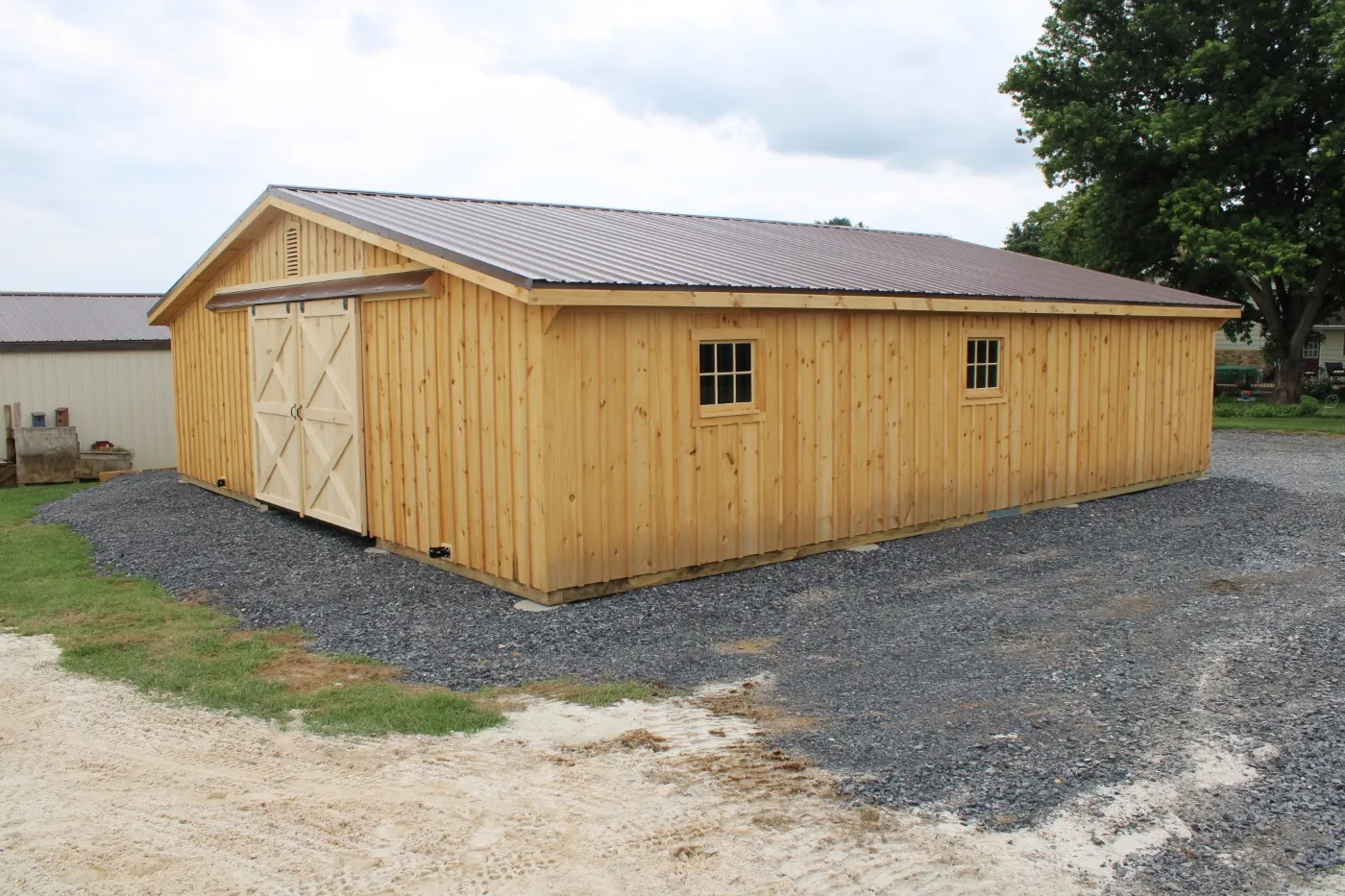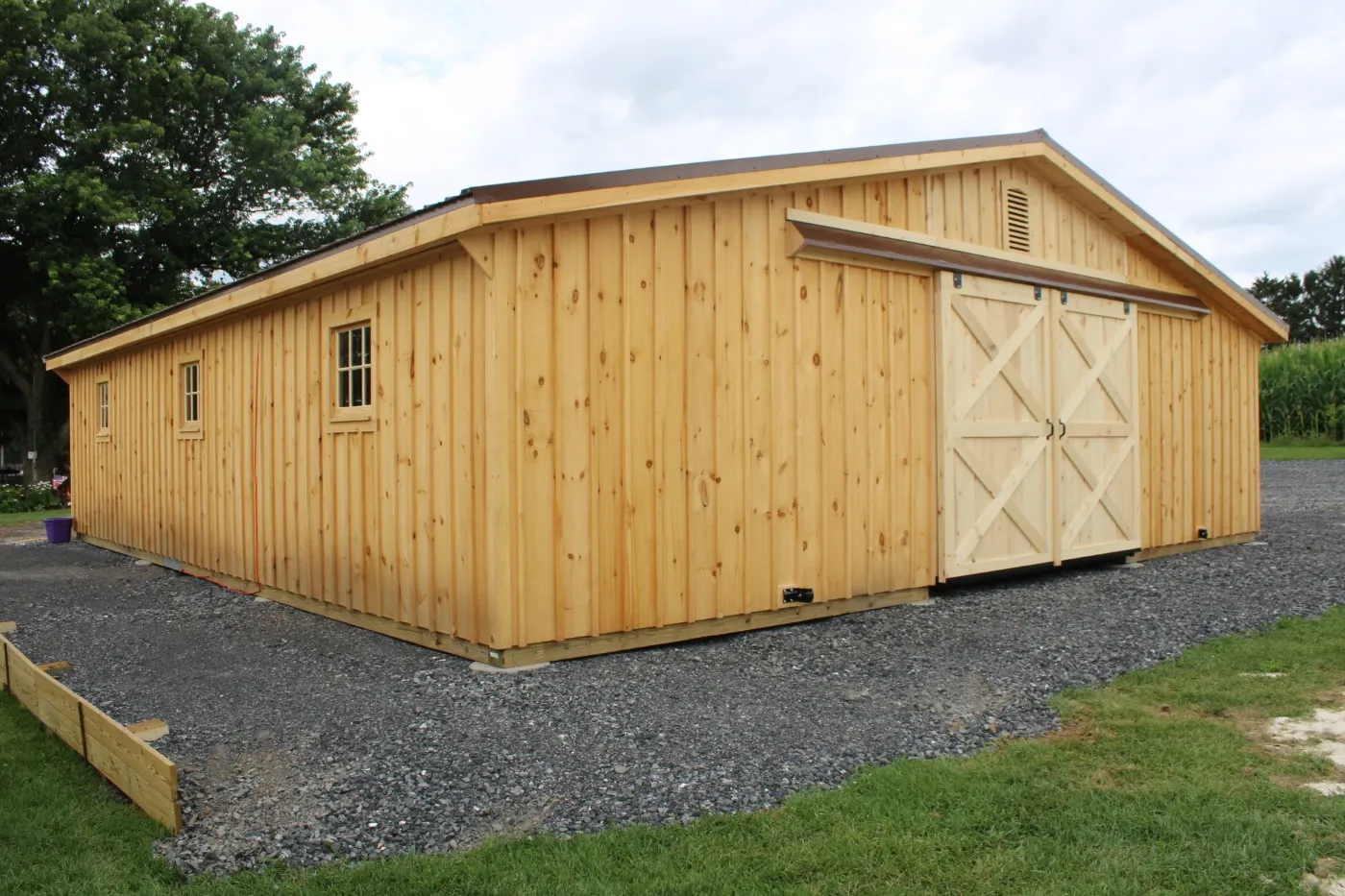 This Trailside style modular barn, located in Shippensburg, PA, features white pine board-and-batten siding. The roof is finished with a brown 29-gauge metal roof and vented with (2) gable vents. All doors are crafted by Appalachian Woodcrafts in Mill Hall, PA.
