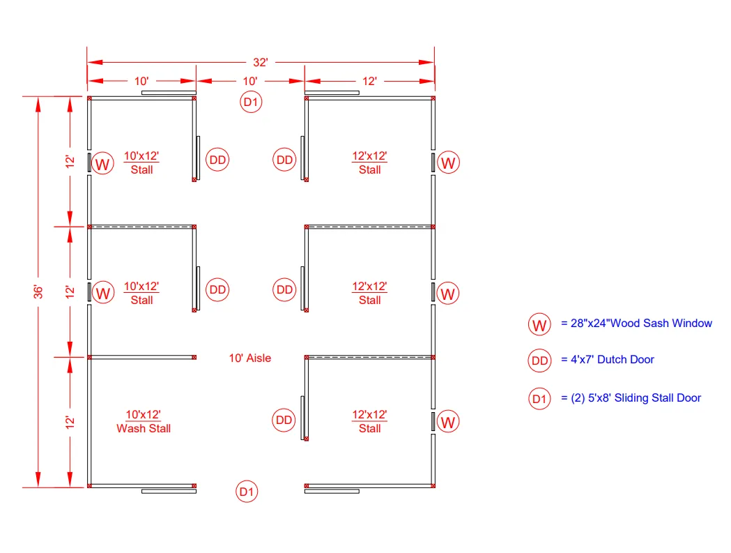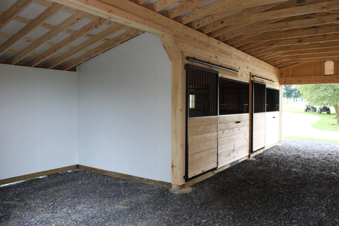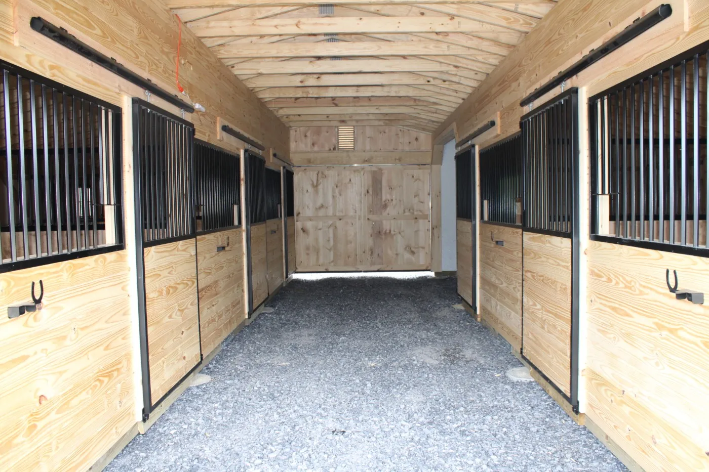 This modular horse barn includes (1) 10'x12' wash stall lined with white glass board, (3) 12'x12' stalls, and (2) 10'x12' stalls, each lined with 4’ high oak kick boards. The center aisle features double 5’x8’ sliding doors. On each end of the barn, near the peak, is a gable vent.